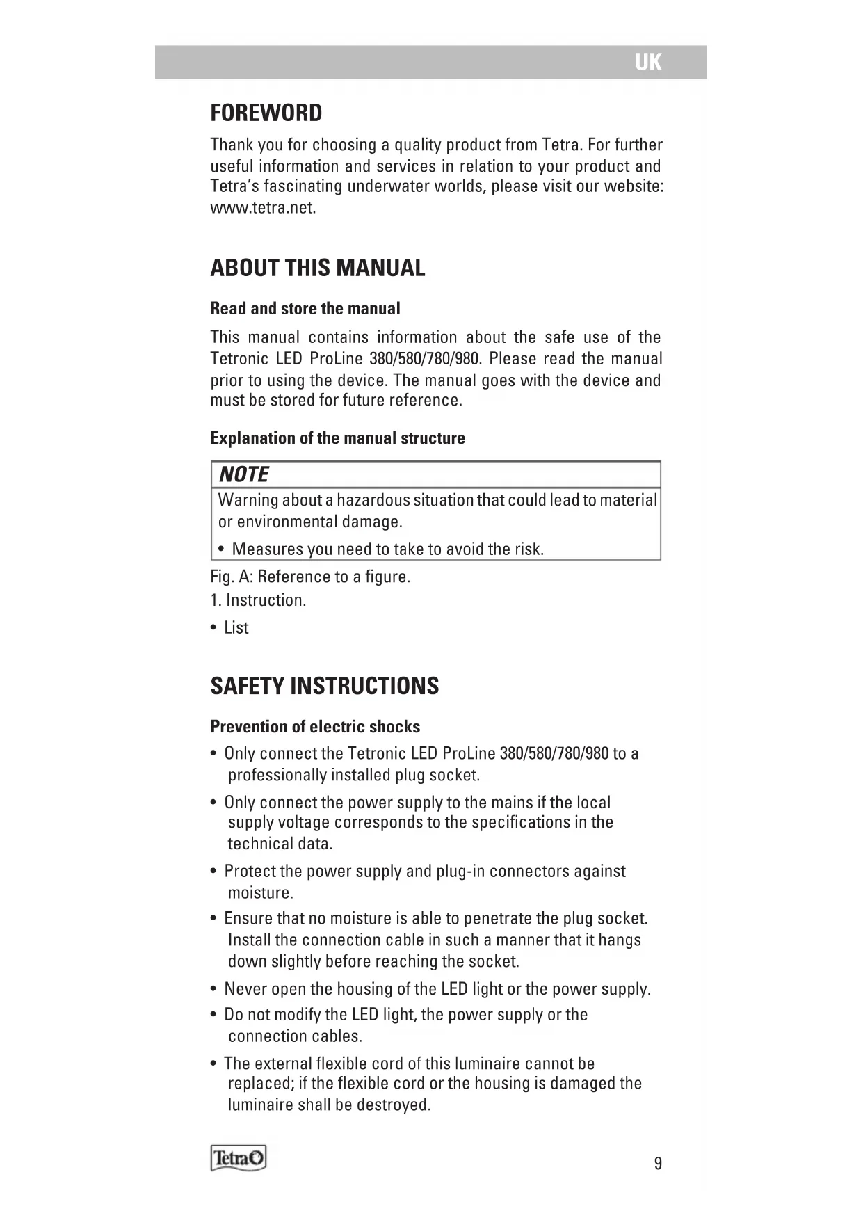 Read and store the manual This manual contains information about the safe use of the Tetronic LED ProLine 380/580/780/980. Please read the manual prior to using the device. The manual goes with the device and must be stored for future reference. Explanation of the manual structure NOTE Warning about a hazardous situation that could lead to material or environmental damage.