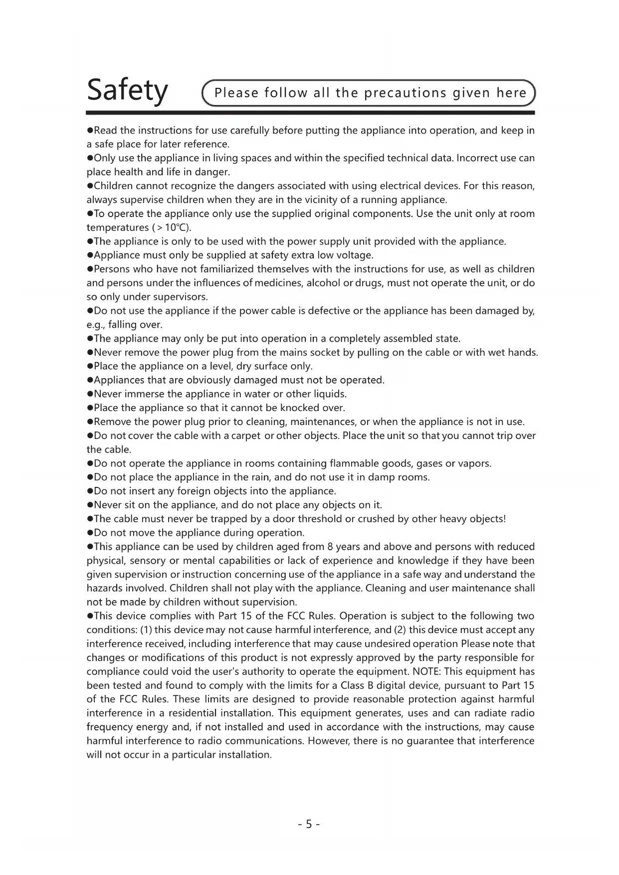 Name of each part - 4 -Safety Read the instructions for use carefully before putting the appliance into operation, and keep in a safe place for later reference. Only use the appliance in living spaces and within the specified technical data. Incorrect use can place health and life in danger. Children cannot recognize the dangers associated with using electrical devices. For this reason, always supervise children when they are in the vicinity of a running appliance. To operate the appliance only use the supplied original components. Use the unit only at room temperatures (>10℃). The appliance is only to be used with the power supply unit provided with the appliance. Appliance must only be supplied at safety extra low voltage. Persons who have not familiarized themselves with the instructions for use, as well as children and persons under the influences of medicines, alcohol or drugs, must not operate the unit, or do so only under supervisors. Do not use the appliance if the power cable is defective or the appliance has been damaged by, e.g., falling over. The appliance may only be put into operation in a completely assembled state. Never remove the power plug from the mains socket by pulling on the cable or with wet hands. Place the appliance on a level, dry surface only. Appliances that are obviously damaged must not be operated. Never immerse the appliance in water or other liquids. Place the appliance so that it cannot be knocked over. Remove the power plug prior to cleaning, maintenances, or when the appliance is not in use. Do not cover the cable with a carpet or other objects. Place the unit so that you cannot trip over the cable. Do not operate the appliance in rooms containing flammable goods, gases or vapors. Do not place the appliance in the rain, and do not use it in damp rooms. Do not insert any foreign objects into the appliance. Never sit on the appliance, and do not place any objects on it. The cable must never be trapped by a door threshold or crushed by other heavy objects! Do not move the appliance during operation. This appliance can be used by children aged from 8 years and above and persons with reduced physical, sensory or mental capabilities or lack of experience and knowledge if they have been given supervision or instruction concerning use of the appliance in a safe way and understand the hazards involved. Children shall not play with the appliance. Cleaning and user maintenance shall not be made by children without supervision. This device complies with Part 15 of the FCC Rules. Operation is subject to the following two conditions: (1) this device may not cause harmful interference, and (2) this device must accept any interference received, including interference that may cause undesired operation Please note that changes or modifications of this product is not expressly approved by the party responsible for compliance could void the user's authority to operate the equipment. NOTE: This equipment has been tested and found to comply with the limits for a Class B digital device, pursuant to Part 15 of the FCC Rules. These limits are designed to provide reasonable protection against harmful interference in a residential installation. This equipment generates, uses and can radiate radio frequency energy and, if not installed and used in accordance with the instructions, may cause harmful interference to radio communications. However, there is no guarantee that interference will not occur in a particular installation. Please follow all the precautions given here - 5 -If this equipment does cause harmful interference to radio or television reception, which can be determined by turning the equipment off and on, the user is encouraged to try to correct the interference by one or more of the following measures: (1) Reorient or relocate the receiving antenna. (2) Increase the separation between the equipment and receiver. (3) Connect the equipment into an outlet on a circuit different from that to which the receiver is connected. (4) Consult the dealer or an experienced radio/TV technician for help. This device contains license-exempt transmitter(s)/receiver(s) that comply with Innovation, Science and Economic Development Canada’s license-exempt RSS(s). Operation is subject to the following two conditions: (1) This device may not cause interference. (2) This device must accept any interference, including interference that may cause undesired operation of the device. This equipment complies with FCC’s and IC’s RF radiation exposure limits set forth for an uncontrolled environment. The antenna(s) used for this transmitter must be installed and operat- ed to provide a separation distance of at least 20 cm from all per sons and must not be collocated or operating in conjunction with any other antenna or transmitter. Installers must ensure that 20cm separation distance will be maintained between the device (excluding its handset) and users. This marking indicates that this product should not be disposed with other house- hold wastes throughout the EU. To prevent possible harm to the environment or human death from uncontrolled waster disposal, recycle it responsibly to promote to the sustainable reuse of material resources. To return your used device, please use the return and collection systems or contact the retailer where the product was purchased. They can take this product for environment safe recycling. This appliance is not intended for use by persons (including children) with reduced physical, sensory or mental capabilities, or lack or experience and knowledge, unless they have been given supervision or instruction concerning use of the appliance by a person responsible for their safety. Children should be supervised to ensure that they do not play with the appliance. This appliance contains a UV-C emitter.