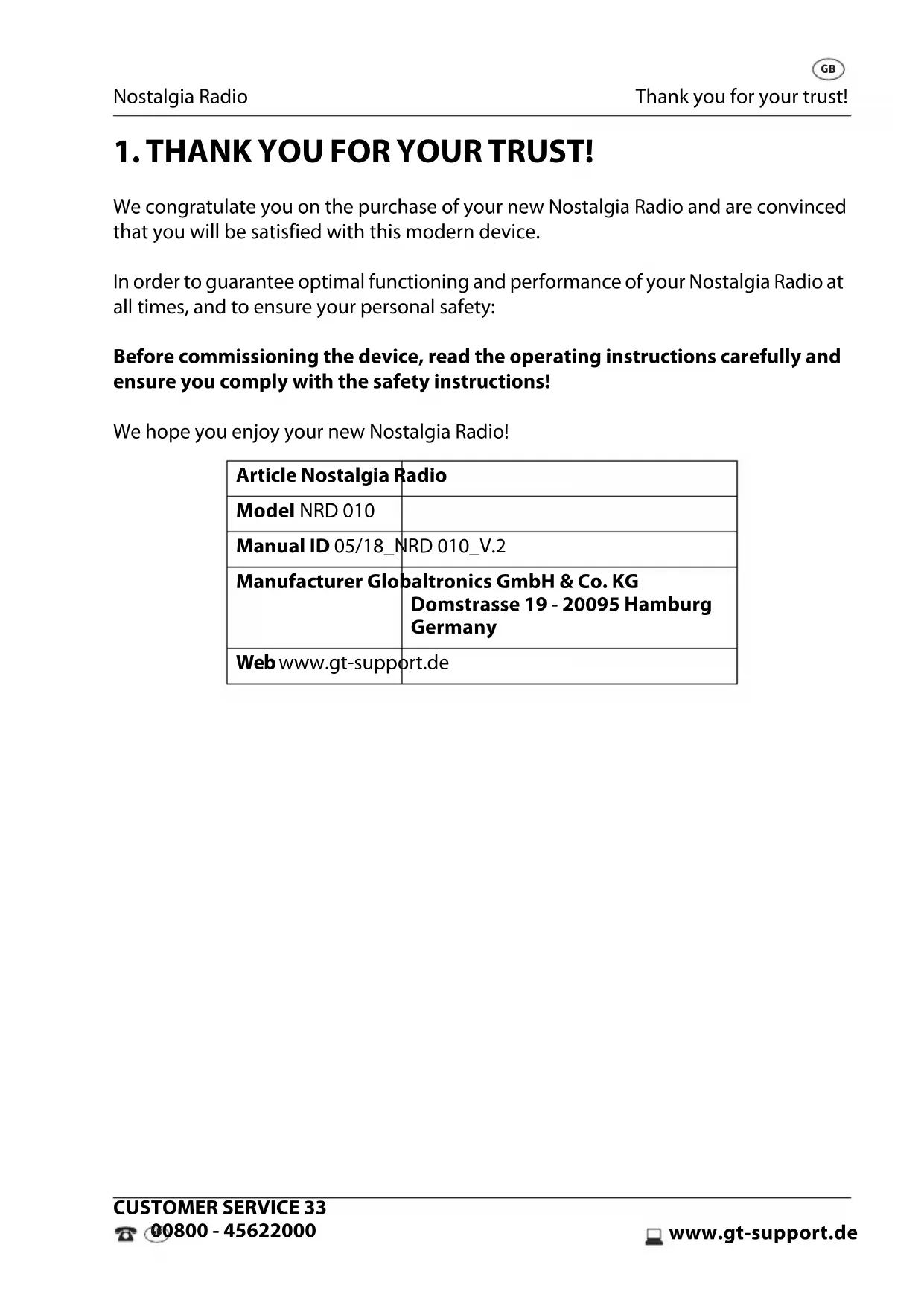 We congratulate you on the purchase of your new Nostalgia Radio and are convinced that you will be satisfied with this modern device. In order to guarantee optimal functioning and performance of your Nostalgia Radio at all times, and to ensure your personal safety: Before commissioning the device, read the operating instructions carefully and ensure you comply with the safety instructions! We hope you enjoy your new Nostalgia Radio! Article Nostalgia Radio Model NRD 010 Manual ID 05/18_NRD 010_V.2 Manufacturer Globaltronics GmbH & Co. KG Domstrasse 19 - 20095 Hamburg Germany Web www.gt-support.de NRD010_2018.book Seite 33 Mittwoch, 29. August 2018 1:52 13General Nostalgia Radio