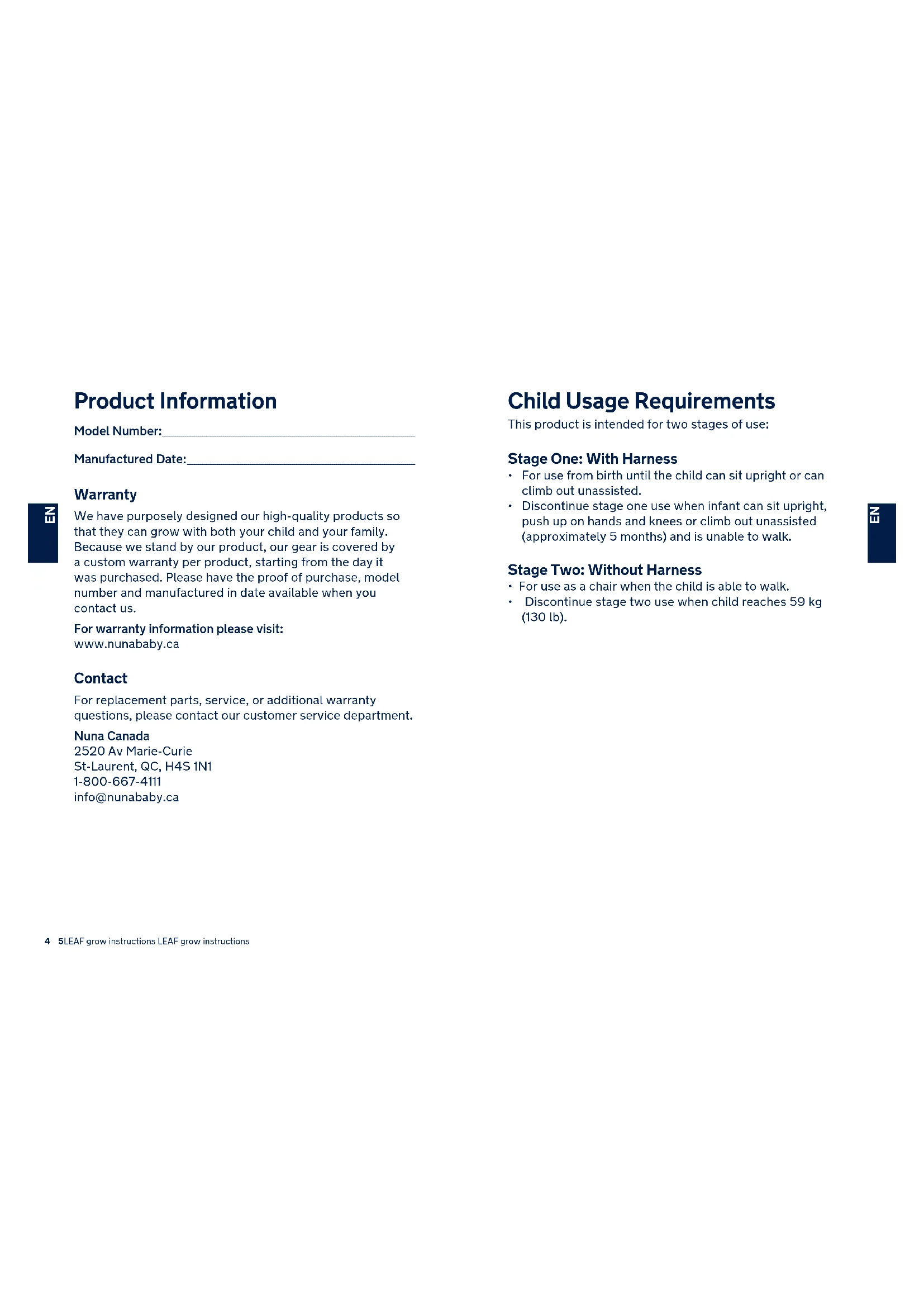 - Discontinue stage two use when child reaches 59 kg (130 lb). Product Information Model Number:____________________________________________________________________________________________________________________________________ Manufactured Date: _______________________________________________________________________________________________________________________ Warranty We have purposely designed our high-quality products so that they can grow with both your child and your family. Because we stand by our product, our gear is covered by a custom warranty per product, starting from the day it was purchased. Please have the proof of purchase, model number and manufactured in date available when you contact us. For warranty information please visit: www.nunababy.ca Contact For replacement parts, service, or additional warranty questions, please contact our customer service department. Nuna Canada 2520 Av Marie-Curie St-Laurent, QC, H4S 1N1 1-800-667-4111 info@nunababy.ca 4 5LEAF grow instructions LEAF grow instructions ENEN FALL HAZARD Babies have suffered skull fractures falling while in and from this product. To prevent falls, stop using the product when infant: