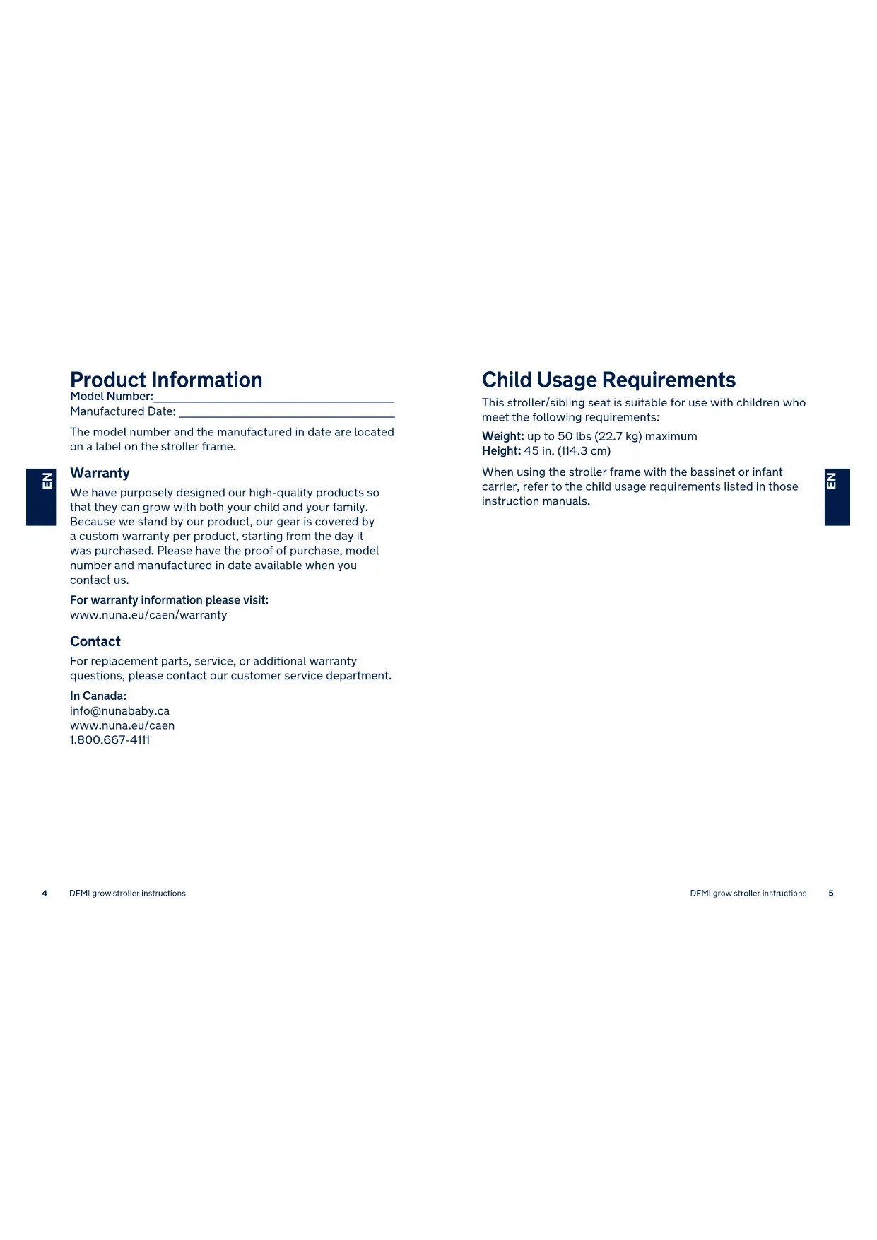 Child Usage Requirements This stroller/sibling seat is suitable for use with children who meet the following requirements: Weight: up to 50 lbs (22.7 kg) maximum Height: 45 in. (114.3 cm) When using the stroller frame with the bassinet or infant carrier, refer to the child usage requirements listed in those instruction manuals. 4 DEMI grow stroller instructions 5DEMI grow stroller instructions Product Information Model Number:__________________________________________________________________ Manufactured Date: ___________________________________________________________ The model number and the manufactured in date are located on a label on the stroller frame. Warranty We have purposely designed our high-quality products so that they can grow with both your child and your family. Because we stand by our product, our gear is covered by a custom warranty per product, starting from the day it was purchased. Please have the proof of purchase, model number and manufactured in date available when you contact us. For warranty information please visit: www.nuna.eu/caen/warranty Contact For replacement parts, service, or additional warranty questions, please contact our customer service department. In Canada: info@nunababy.ca www.nuna.eu/caen