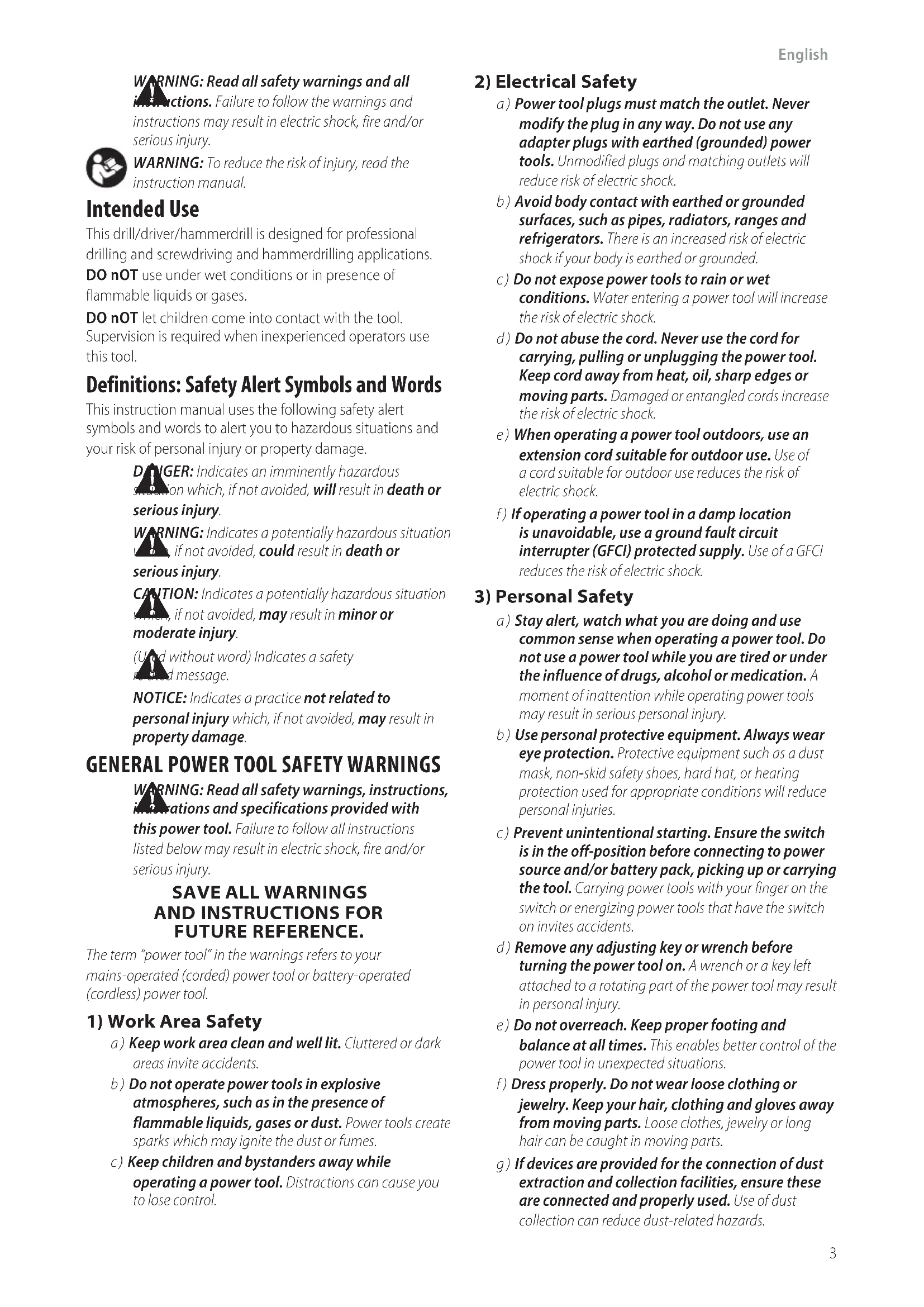 (Used without word) Indicates a safety relatedmessage. NOTICE: Indicates a practice not related to personal injury which, if not avoided, may result in propertydamage. Intended Use This drill/driver/hammerdrill is designed for professional drilling and screwdriving and hammerdrillingapplications. DO nOT use under wet conditions or in presence of flammable liquids orgases. DO nOT let children come into contact with the tool. Supervision is required when inexperienced operators use thistool. English (original instructions)