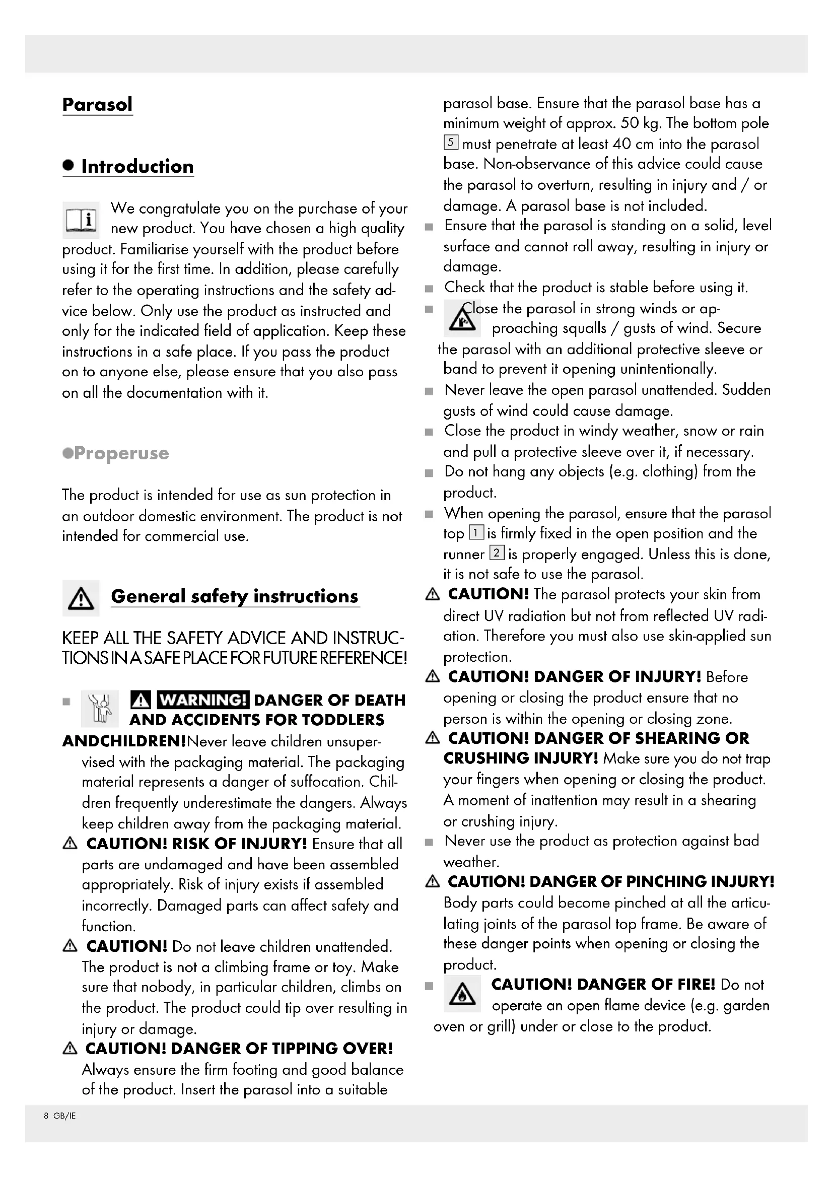 is properly engaged. Unless this is done, it is not safe to use the parasol. CAUTION! The parasol protects your skin from direct UV radiation but not from reflected UV radi- ation. Therefore you must also use skin-applied sun protection. CAUTION! DANGER OF INJURY! Before opening or closing the product ensure that no person is within the opening or closing zone.