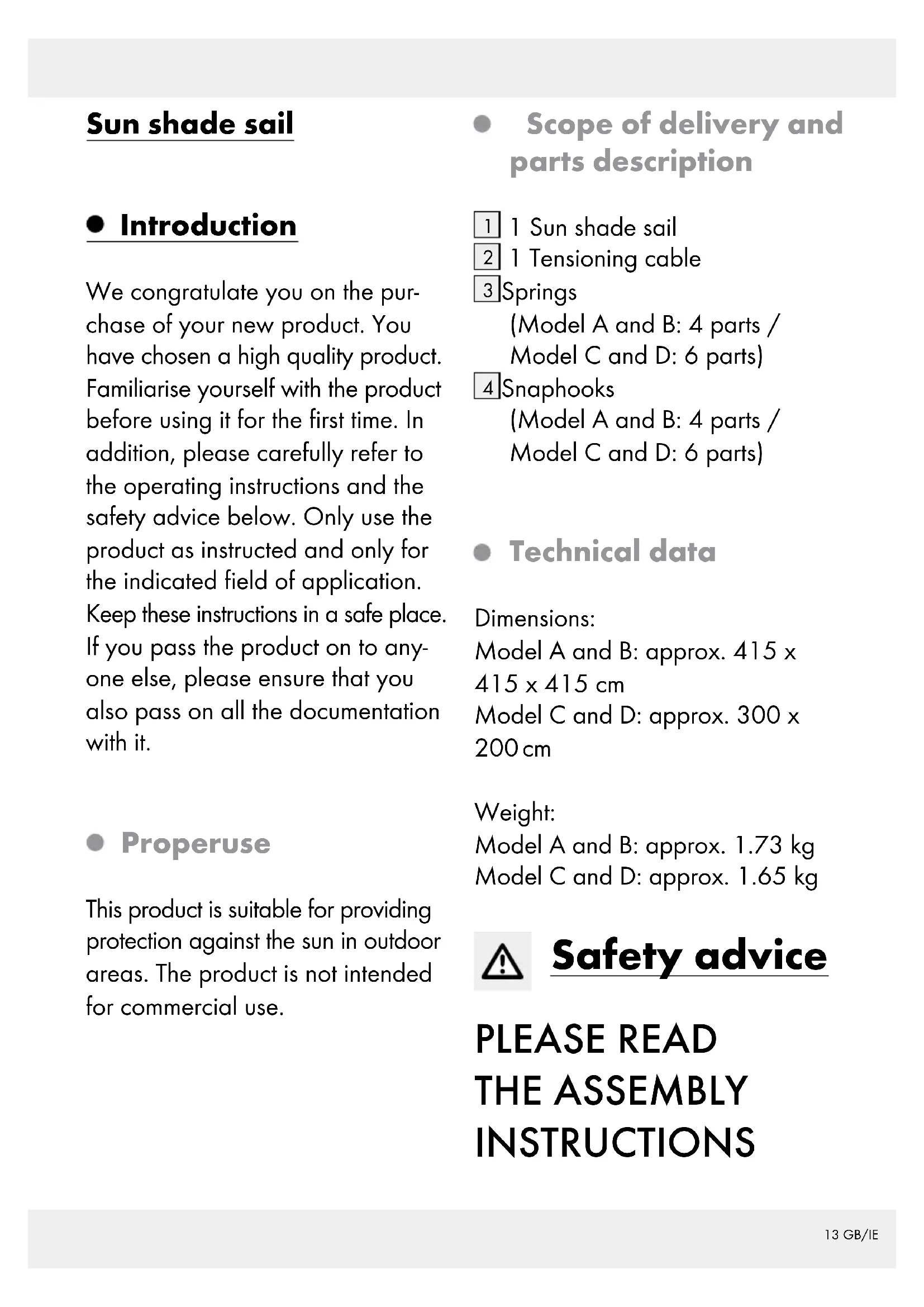 DENTS FOR INFANTS AND CHILDREN! Never leave children alone and unsupervised with the packaging material. It poses a danger of suffocation. Keep children away from the work area when the product is being assembled. It poses a risk of suf- focation as children may swallow or in- hale small parts or plastic film. CAUTION! RISK OF INJURY! En- sure that all parts are undamaged and have been as- sembled appropri- ately. Risk of injury exists if assembled incorrectly. Dam- aged parts can affect safety and function. Check regularly that all parts are firmly in position. Tighten the ring bolts if15 GB/IE necessary using a pair of pliers. Take care that you do not trap or crush your fingers while assembling the product. The sail protects you against direct sun impact. Nevertheless take care about a sufficient sun pro- tection for your skin. CAUTION! RISK OF INJURY! Never under any circumstances as- semble the product in a strong wind or rain. Select a piece of land that is as flat and firm as possible to erect your sun shade sail. Assembly in the wrong order could damage the sun shade sail. The man- ufacturer accepts no liability of any kind. CAUTION! DANGER OF POISONING AND DAMAGE TO PROPERTY! Do not light any fires underneath the product and keep it away from sources of heat.16 GB/IE You should also familiarise yourself with the local fire protection regula- tions (e.g. camping site, tent pitch). Take note of the effects of the weather and climate Take down the sun shade sail before heavy snowfall or a storm or rain. Damaged poles or other components should be replaced by new ones.
