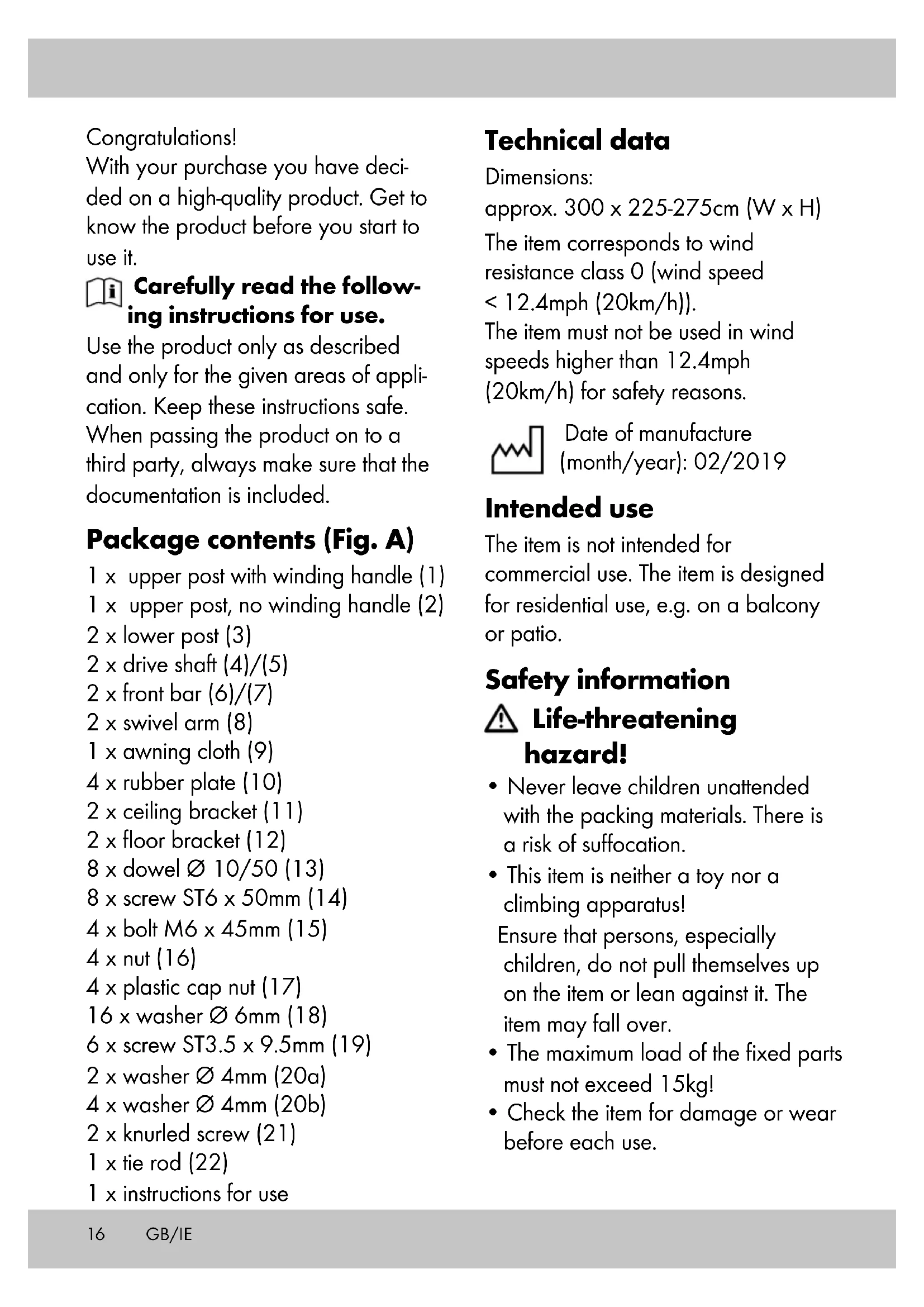 - Check the item regularly for visible signs of wear and damage. Check the screw connections regularly. Important pre-installation information WARNING! Before you start installing the clamping awning, measure the height between the floor and the ceiling. WARNING! Assembling the item requires at least two people due to its size. WARNING! As tools/machinery need to be used, manual skills are indispensable. Suitable installation site For ceiling installation, a concrete ceiling or a load-bearing wooden beam construction is suitable.18 For floor installation, a concrete foundation or concrete slab of at least 50 x 50 x 5cm (L x W x D) is suitable. Note: Alternative installation conditions must have the load-bearing capacity and strength inspected by a specialist. Suitable installation materials Before installing the item, the material must be determined. If the installation site is load bearing, then the appropriate materials for fixing to it must be selected. Fixing materials: