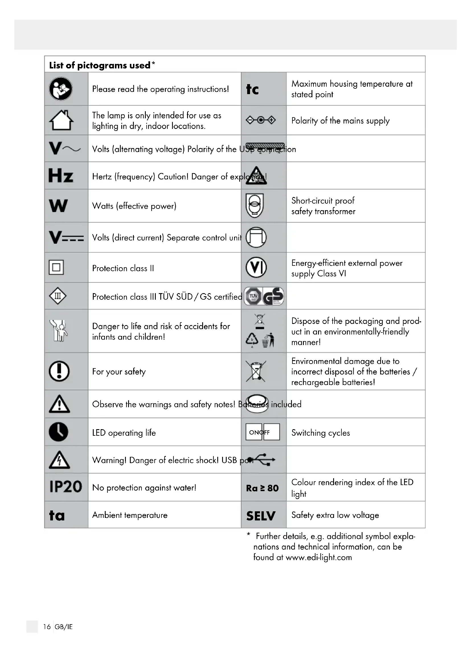 Maximum housing temperature at stated point The lamp is only intended for use as lighting in dry, indoor locations. Polarity of the mains supply Volts (alternating voltage) Polarity of the USB connection Hertz (frequency) Caution! Danger of explosion! Watts (effective power) Short-circuit proof safety transformer Volts (direct current) Separate control unit Protection class II Energy-efficient external power supply Class VI Protection class III TÜV SÜD / GS certified Danger to life and risk of accidents for infants and children!