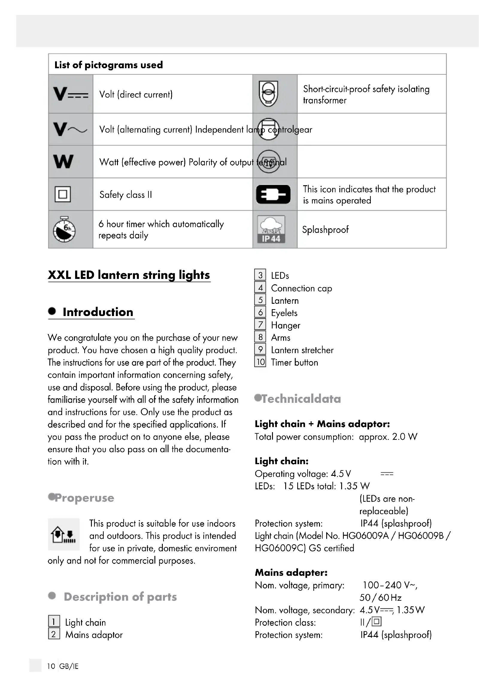 Timer button Technical data Light chain + Mains adaptor: Total power consumption: approx. 2.0 W Light chain: Operating voltage: 4.5 V LEDs: 15 LEDs total: 1.35 W (LEDs are non- replaceable) Protection system: IP44 (splashproof) Light chain (Model No. HG06009A / HG06009B / HG06009C) GS certified Mains adapter: Nom. voltage, primary: 100‒240 V∼, 50 / 60 Hz Nom. voltage, secondary: 4.5 V , 1.35 W Protection class: II / Protection system: IP44 (splashproof)11 GB/IE Mains adapter (Model No.: DS-DZ045DC0135H-IP44) GS certified SELV: Safety extra low voltage Ta: Maximum rated ambient temperature Included items 1 XXL LED lantern string lights 15 lanterns 1 mains adapter 1 operating instructions Safety information