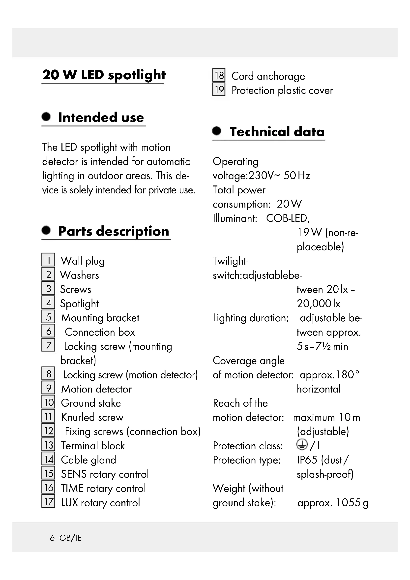 Protection plastic cover Technical data Operating voltage: 230 V∼ 50 Hz Total power consumption: 20 W Illuminant: COB-LED, 19 W (non-re- placeable) Twilight- switch: adjustable be- tween 20 lx – 20,000 lx Lighting duration: adjustable be- tween approx. 5 s–7½ min Coverage angle of motion detector: approx.180° horizontal Reach of the motion detector: maximum 10 m (adjustable) Protection class: / I Protection type: IP65 (dust / splash-proof) Weight (without ground stake): approx. 1055 g7 GB/IE Dimension (without ground stake): approx. 18 x 23 x 10 cm TÜV / GS tested. Scope of delivery 1 LED spotlight with motion detector 2 Wall plugs (Ø 8 mm) 2 Washers (Ø 20 mm) 2 Screws (6 mm x 50 mm) 1 Ground stake 1 Cord anchorage 1 Protection plastic cover 1 Set of mounting and operating instructions General safety instructions Before using the product, please familiarise yourself with all of the safety information and instructions for use! When passing this product on to others, please also include all the documents!