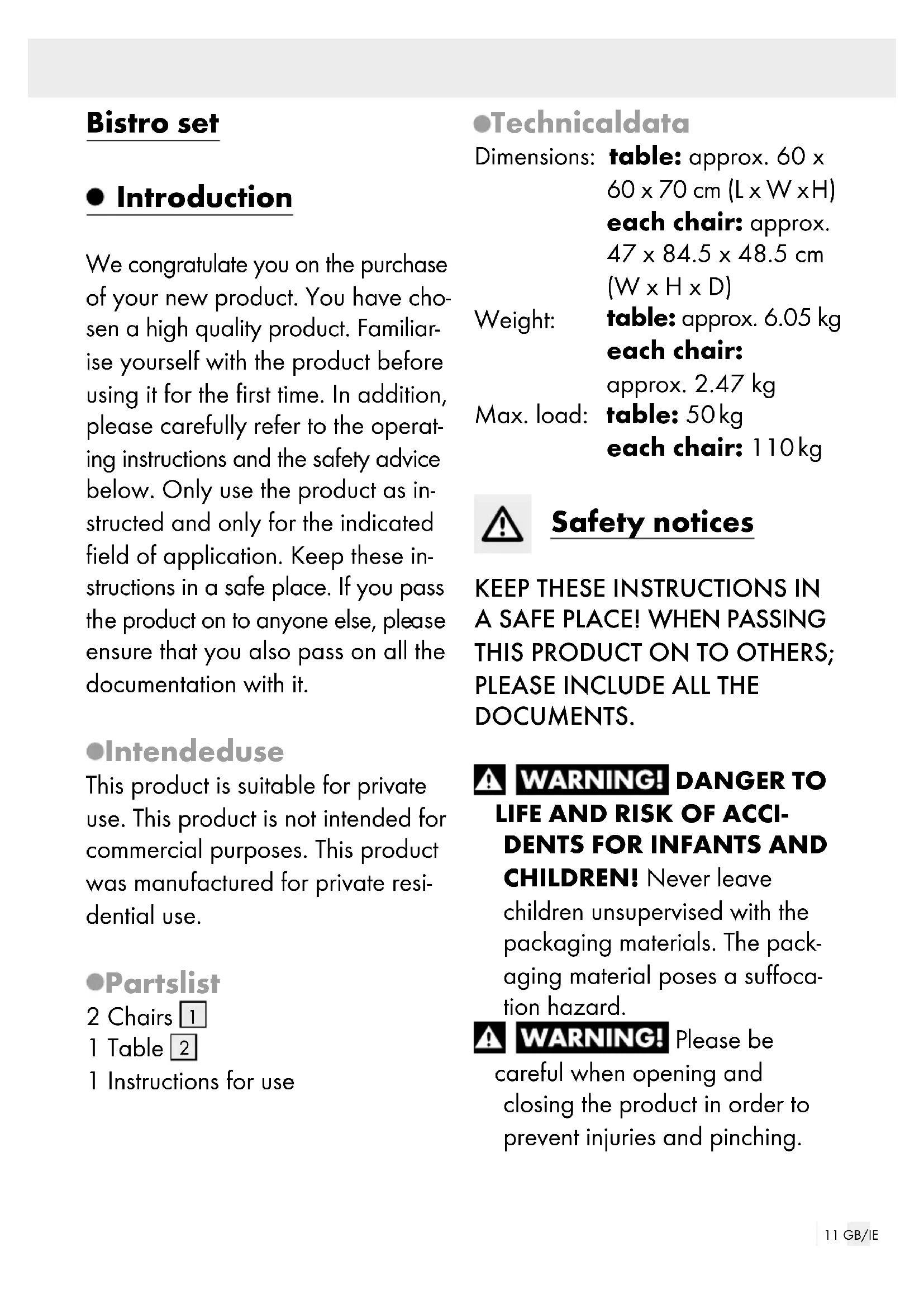 each chair: approx. 47 x 84.5 x 48.5 cm (W x H x D) Weight: table: approx. 6.05 kg each chair: approx. 2.47 kg Max. load: table: 50 kg each chair: 110 kg Safety notices