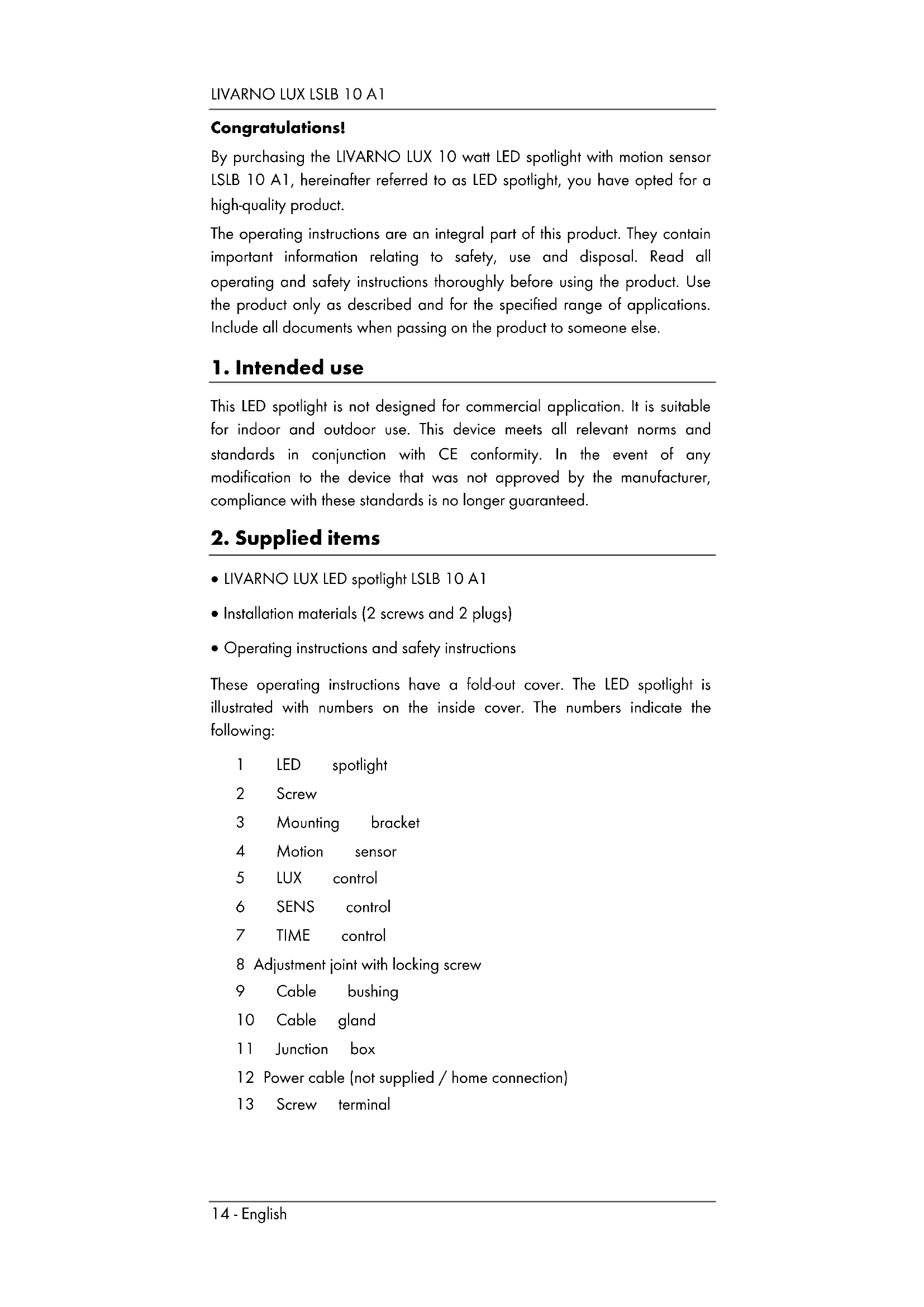 By purchasing the LIVARNO LUX 10 watt LED spotlight with motion sensor LSLB 10 A1, hereinafter referred to as LED spotlight, you have opted for a high-quality product.