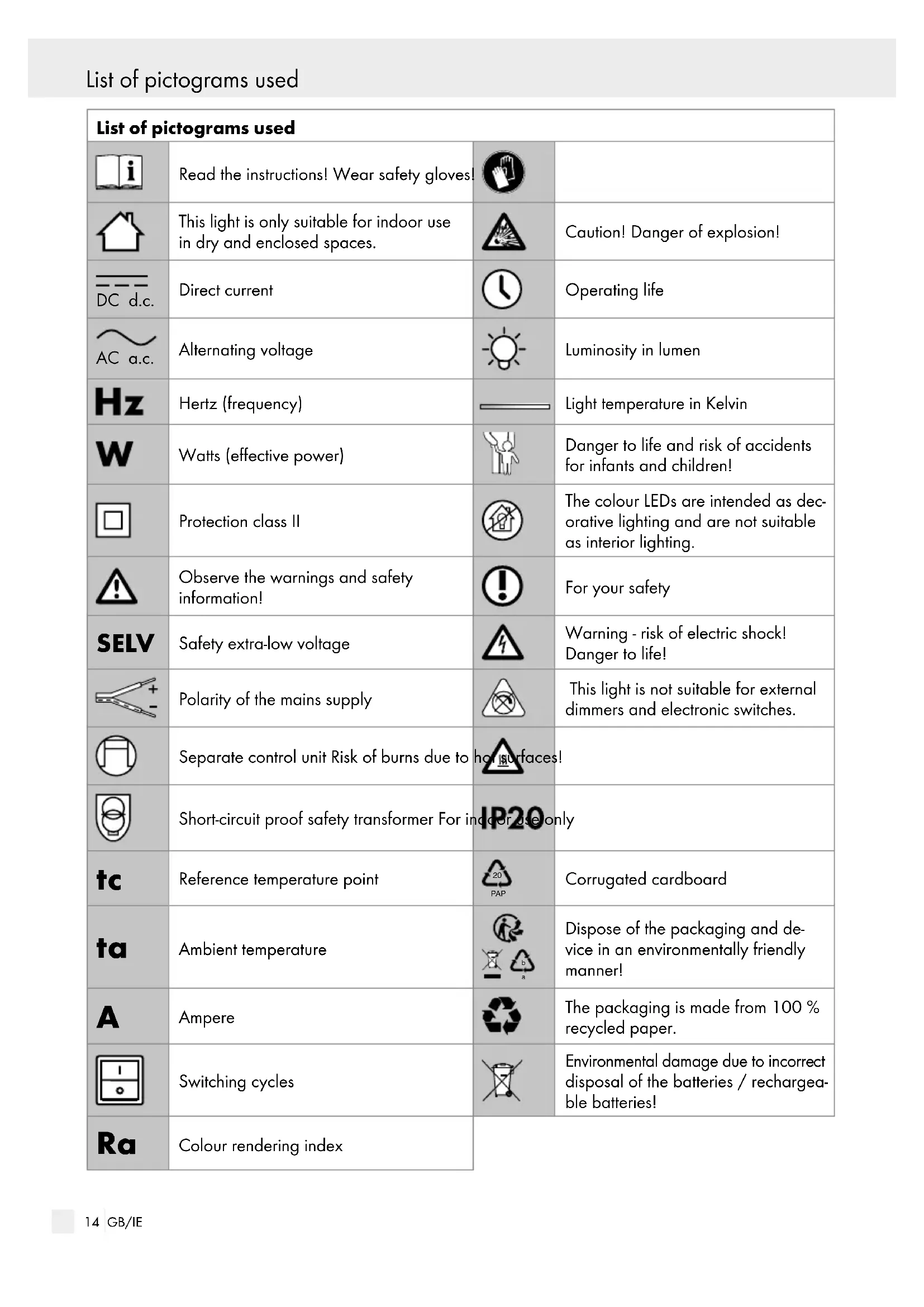 Colour rendering index Introduction15 GB/IE List of pictograms used Introduction Smart LED mood light Introduction Congratulations on the purchase of your new device. You have selected a high quality product. Please be sure to carefully read all the instructions for use. These instructions are part of the product and contain important informa- tion on setup and operation. Always observe all safety information. Before using this product for the first time, verify that the correct voltage is available and that all parts are properly assembled. If you have any questions or are unsure about using this device, please contact your retailer or the service centre. Please keep these instructions in a safe place and include them when passing this product on to others. Intended use This light is only suitable for indoor use in dry and enclosed spaces. This light is only intended for private residential use, not for commercial use. Any use other than that de- scribed above is prohibited and will result in product damage. This is further associated with dangers, e.g. short-circuit, fire, electric shock, etc. This product is intended for normal operation. The colour LEDs are intended as decora- tive lighting and are not suitable as inte- rior lighting. Scope of delivery Check that all the parts are present and that the device is in perfect condition immediately after unpacking. 1 LED mood light, model 14148906L 1 Set of instructions for use Parts description