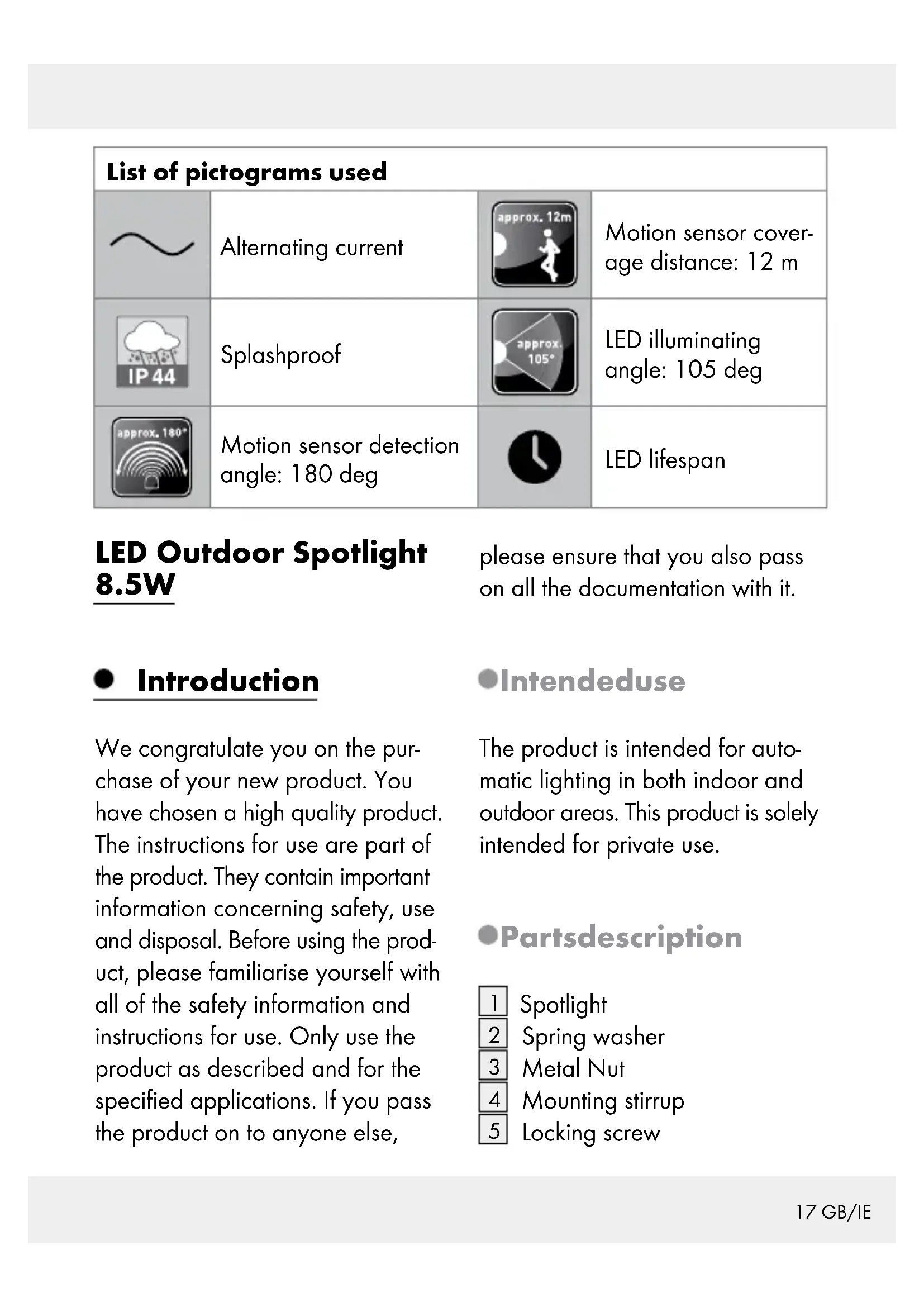 Dimming switch: Adjustable from 10 lx– 20,000 lx Light on time: Adjustable between approx.10 s – 4 min Protection class: I Protection class: IP44 (Splashproof) Dimensions (H x W x D): approx. 197 x 149 x 121 mm Projected area: max. 190 x 149 mm Mounting height: approx. 2.5 m Weight: approx. 640 g Scope of delivery 1 LED Spotlight with motion detector 2 Wall plugs (Ø 6 mm) 2 Screws 1 Set of mounting and operating instructions General safety instructions Before using the product, please familiarise yourself with all of the safety information and instructions for use! When passing this product on to others, please also include all the documents!19 GB/IE