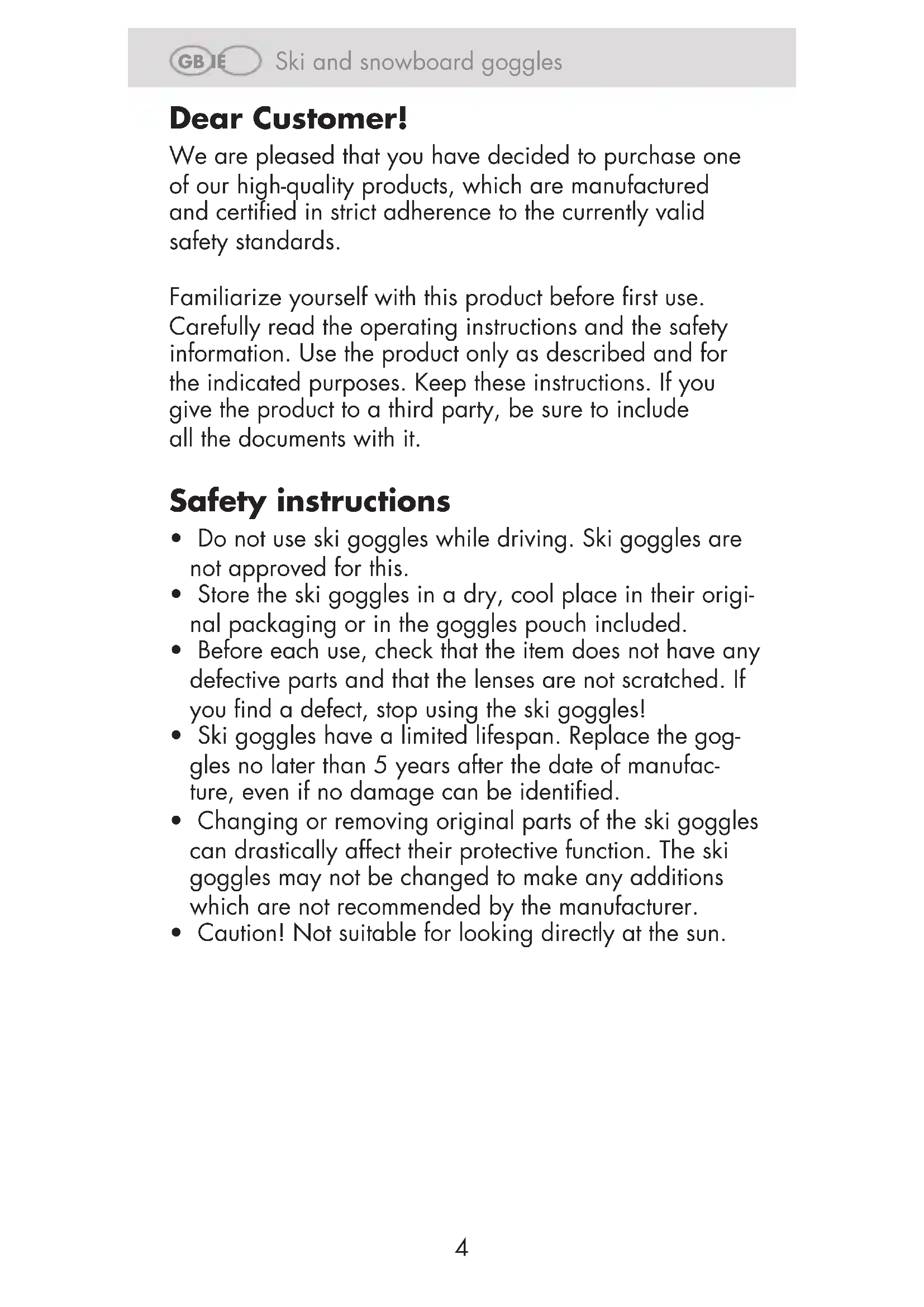 - Ski goggles have a limited lifespan. Replace the goggles no later than 5 years after the date of manufacture, even if no damage can be identified.