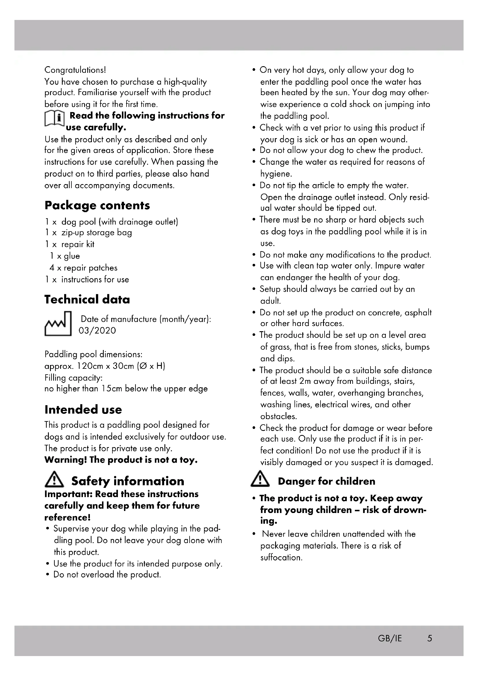 - Never leave children unattended with the packaging materials. There is a risk of suffocation. GB/IE6 GB/IE Setting up and filling the pad- dling pool Setup should always be carried out by an adult.