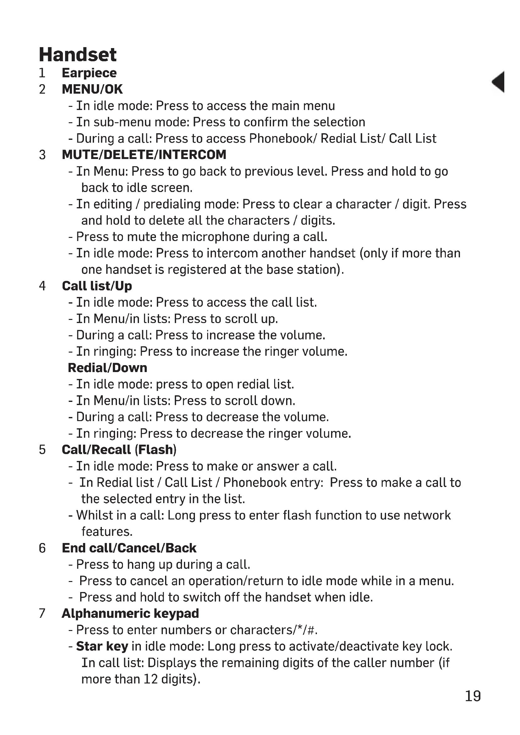 - In Menu: Press to go back to previous level. Press and hold to go back to idle screen. - In editing / predialing mode: Press to clear a character / digit. Press and hold to delete all the characters / digits. - Press to mute the microphone during a call. - In idle mode: Press to intercom another handset (only if more than one handset is registered at the base station). 4 Call list/Up - In idle mode: Press to access the call list. - In Menu/in lists: Press to scroll up. - During a call: Press to increase the volume. - In ringing: Press to increase the ringer volume. Redial/Down - In idle mode: press to open redial list. - In Menu/in lists: Press to scroll down. - During a call: Press to decrease the volume. - In ringing: Press to decrease the ringer volume. 5 Call/Recall (Flash) - In idle mode: Press to make or answer a call. - In Redial list / Call List / Phonebook entry: Press to make a call to the selected entry in the list. - Whilst in a call: Long press to enter flash function to use network features. 6 End call/Cancel/Back - Press to hang up during a call. - Press to cancel an operation/return to idle mode while in a menu. - Press and hold to switch off the handset when idle. 7 Alphanumeric keypad - Press to enter numbers or characters/*/#. - Star key in idle mode: Long press to activate/deactivate key lock. In call list: Displays the remaining digits of the caller number (if more than 12 digits).