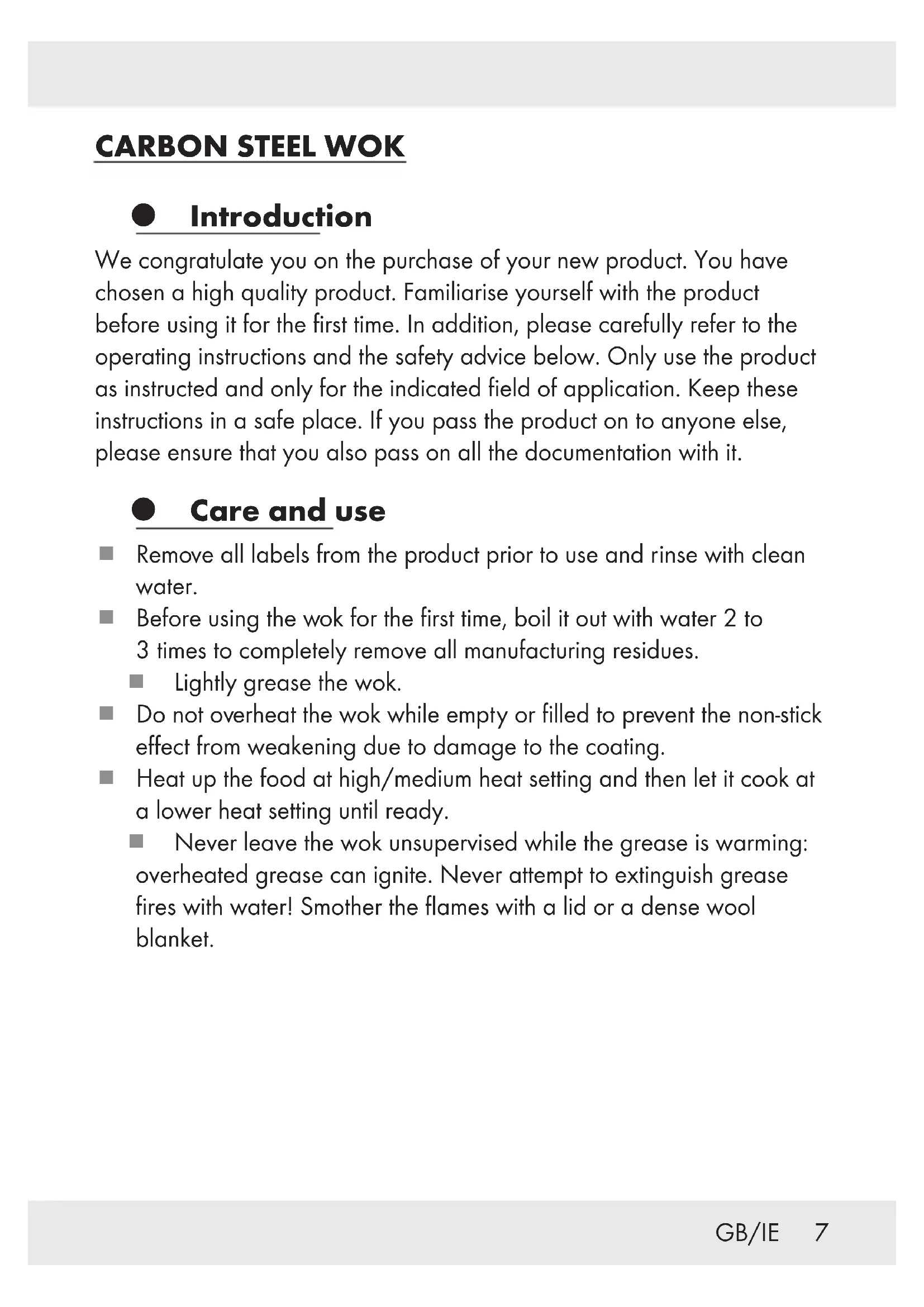 Introduction We congratulate you on the purchase of your new product. You have chosen a high quality product. Familiarise yourself with the product before using it for the first time. In addition, please carefully refer to the operating instructions and the safety advice below. Only use the product as instructed and only for the indicated field of application. Keep these instructions in a safe place. If you pass the product on to anyone else, please ensure that you also pass on all the documentation with it. Care and use Remove all labels from the product prior to use and rinse with clean water. Before using the wok for the first time, boil it out with water 2 to 3 times to completely remove all manufacturing residues. Lightly grease the wok. Do not overheat the wok while empty or filled to prevent the non-stick effect from weakening due to damage to the coating. Heat up the food at high/medium heat setting and then let it cook at a lower heat setting until ready. Never leave the wok unsupervised while the grease is warming: overheated grease can ignite. Never attempt to extinguish grease fires with water! Smother the flames with a lid or a dense wool blanket.8 GB/IE Only use plastic or wooden kitchen utensils to prevent damaging the non-stick coating. Do not add dripping wet meat to the wok. Grease splatting onto a glowing hob can easily cause a fire. The handle may get hot during cooking. Use a pot holder or grill gloves for your protection. The wok is suitable for gas and electric cookers. The wok is not suitable to put in an oven. Not oven safe. Select the correct cooking plate for the diameter of your wok to avoid heat loss. This wok is not suitable for dishwashers. Avoid using sharp or pointy objects or brushes to avoid damaging the material. Never hold the hot product under cold running water. For washing the product by hand, use hot water with a little ordinary washing-up liquid. Frequently cleaning of the wok with harsh cleaners may damage it and can cause discoloration. Food safe: this wok does not affect the taste or odour of prepared foods. Never use the wok if the handles are loose.9GB/IE Disposal The packaging is made entirely of recyclable materials, which you may dispose of at local recycling facilities. Contact your local refuse disposal authority for more details of how to dispose of your worn-out product. Warranty The product has been manufactured to strict quality guidelines and meticulously examined before delivery. In the event of product defects you have legal rights against the retailer of this product. Your legal rights are not limited in any way by our warranty detailed below. The warranty for this product is 3 years from the date of purchase. Should this product show any fault in materials or manufacture within 3 years from the date of purchase, we will repair or replace it – at our choice – free of charge to you. The warranty period begins on the date of purchase. Please keep the original sales receipt in a safe location. This document is required as your proof of purchase. This warranty becomes void if the product has been damaged, or used or maintained improperly. The warranty applies to defects in material or manufacture. This warranty does not cover product parts subject to normal wear, thus possibly considered consumables (e.g. batteries) or for damage to fragile parts, e.g. switches, rechargeable batteries or glass parts.10 GB/IE Warranty claim procedure To ensure quick processing of your case, please observe the following instructions: Please have the till receipt and the item number (e.g. IAN 123456_7890) available as proof of purchase. You will find the item number on the rating plate, an engraving, on the front page of the instructions for use (bottom left), or as a sticker on the rear or bottom of the product. If functional or other defects occur, please contact the service department listed either by telephone or by e-mail. You can return a defective product to us free of charge to the service address that will be provided to you. Ensure that you enclose the proof of purchase (till receipt) and information about what the defect is and when it occurred. Service Service Great Britain Tel.: 08000569216 E-Mail: owim@lidl.co.uk Service Ireland Tel.: 1800 200736 E-Mail: owim@lidl.ie11 FR/BE