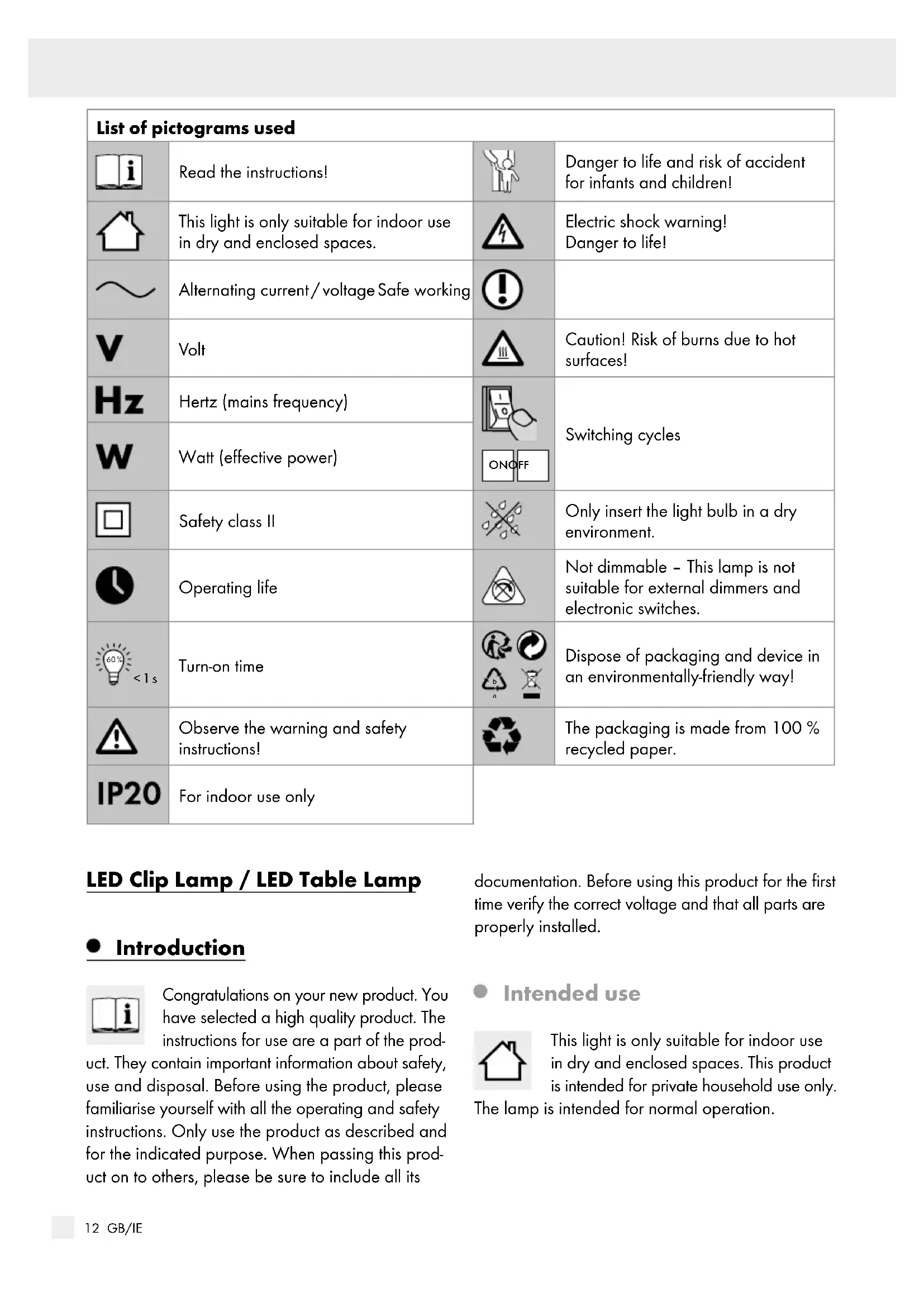Dispose of packaging and device in an environmentally-friendly way! Observe the warning and safety instructions! The packaging is made from 100 % recycled paper. For indoor use only LED Clip Lamp / LED Table Lamp Introduction Congratulations on your new product. You have selected a high quality product. The instructions for use are a part of the prod- uct. They contain important information about safety, use and disposal. Before using the product, please familiarise yourself with all the operating and safety instructions. Only use the product as described and for the indicated purpose. When passing this prod- uct on to others, please be sure to include all its documentation. Before using this product for the first time verify the correct voltage and that all parts are properly installed.