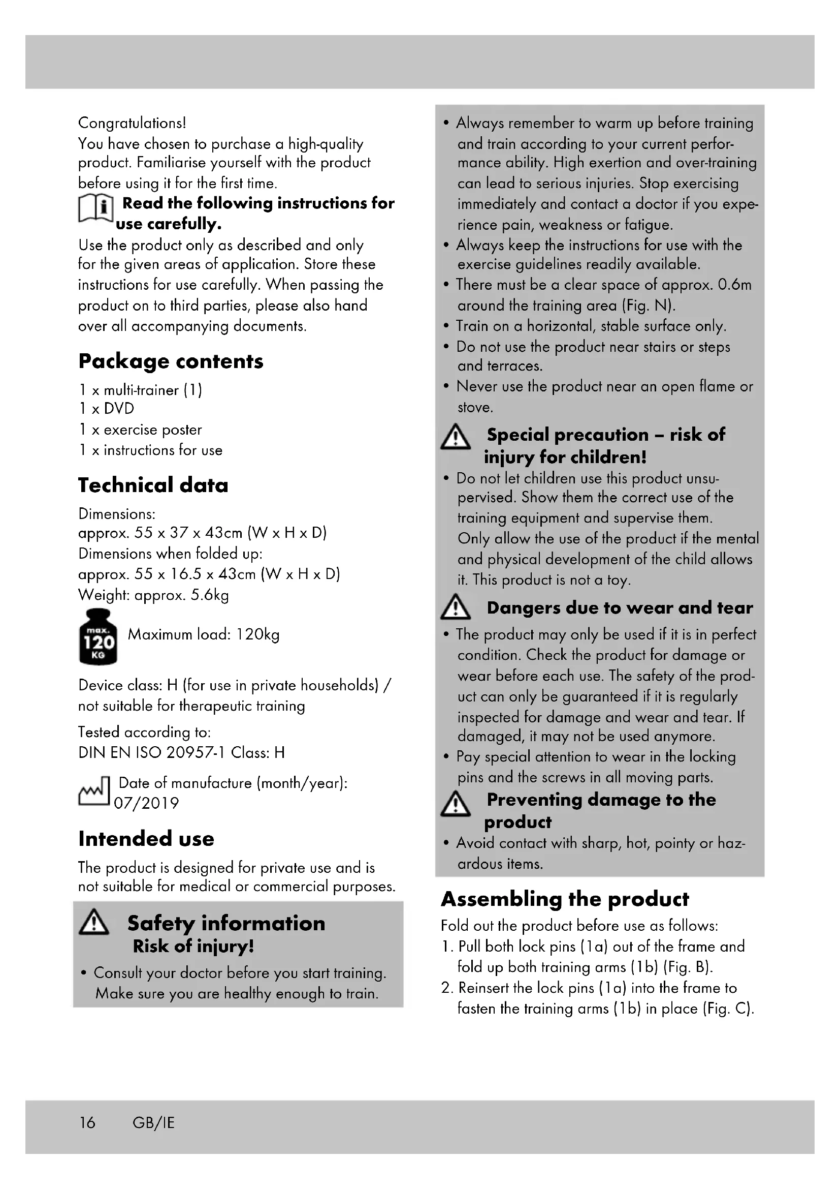 Device class: H (for use in private households) / not suitable for therapeutic training