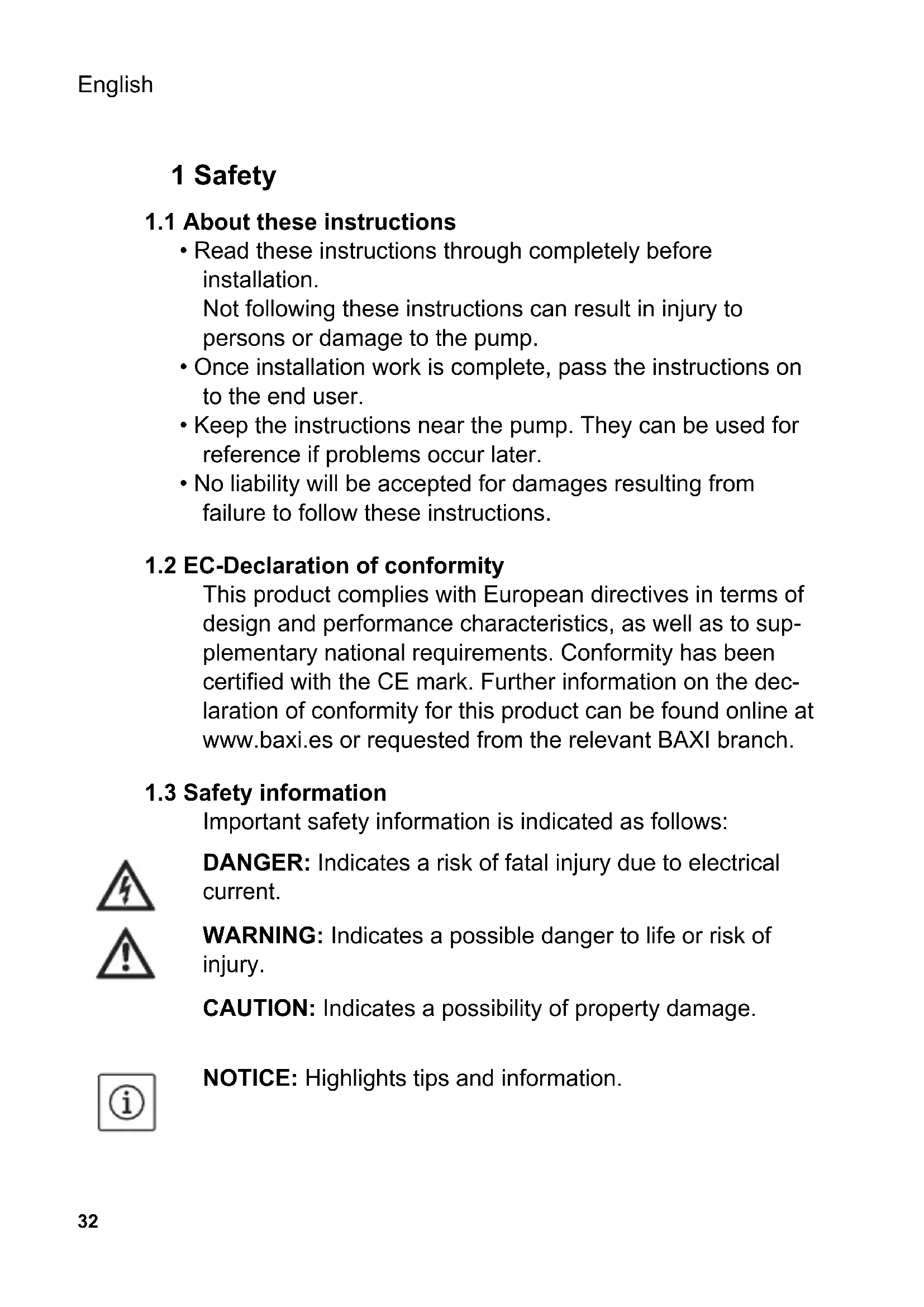 This product complies with European directives in terms of design and performance characteristics, as well as to sup- plementary national requirements. Conformity has been certified with the CE mark. Further information on the dec- laration of conformity for this product can be found online at www.baxi.es or requested from the relevant BAXI branch.