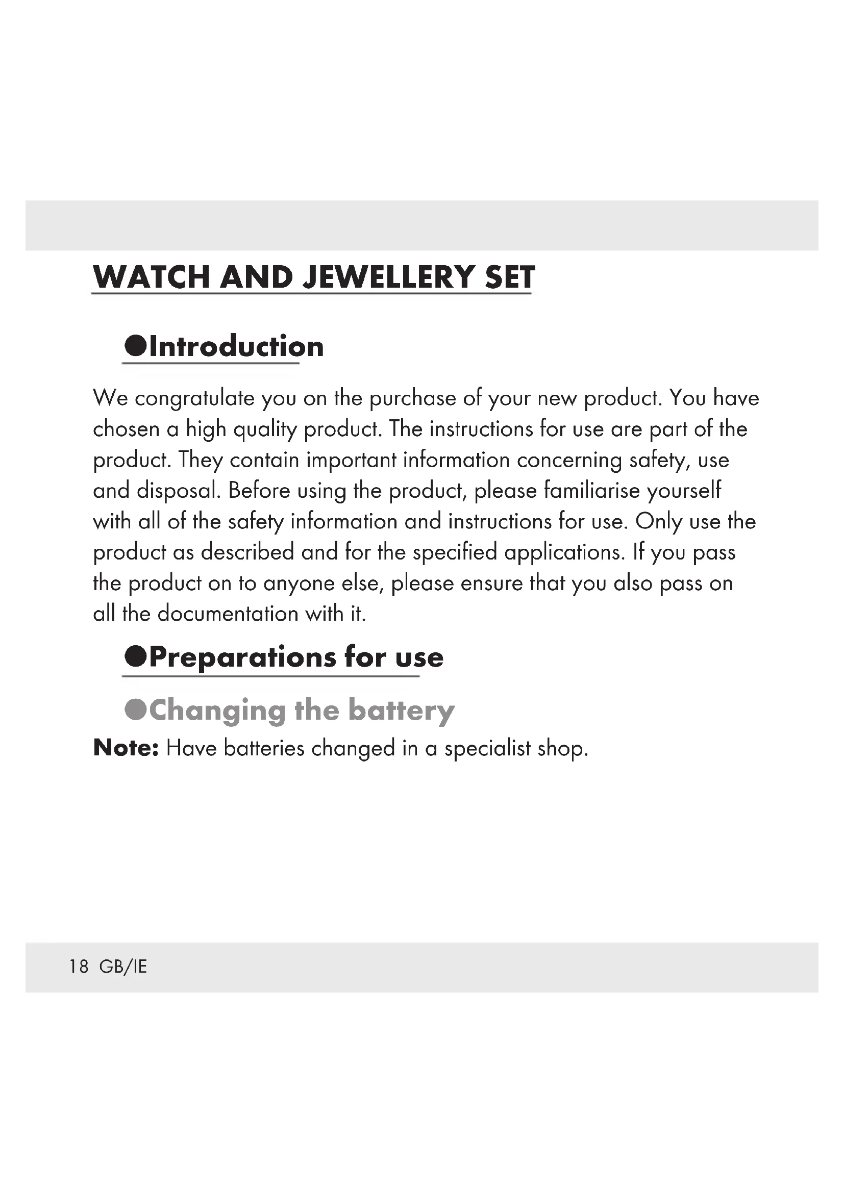 P Introduction We congratulate you on the purchase of your new product. You have chosen a high quality product. The instructions for use are part of the product. They contain important information concerning safety, use and disposal. Before using the product, please familiarise yourself with all of the safety information and instructions for use. Only use the product as described and for the specified applications. If you pass the product on to anyone else, please ensure that you also pass on all the documentation with it. P Preparations for use P Changing the battery Note: Have batteries changed in a specialist shop.19 GB/IE P Display