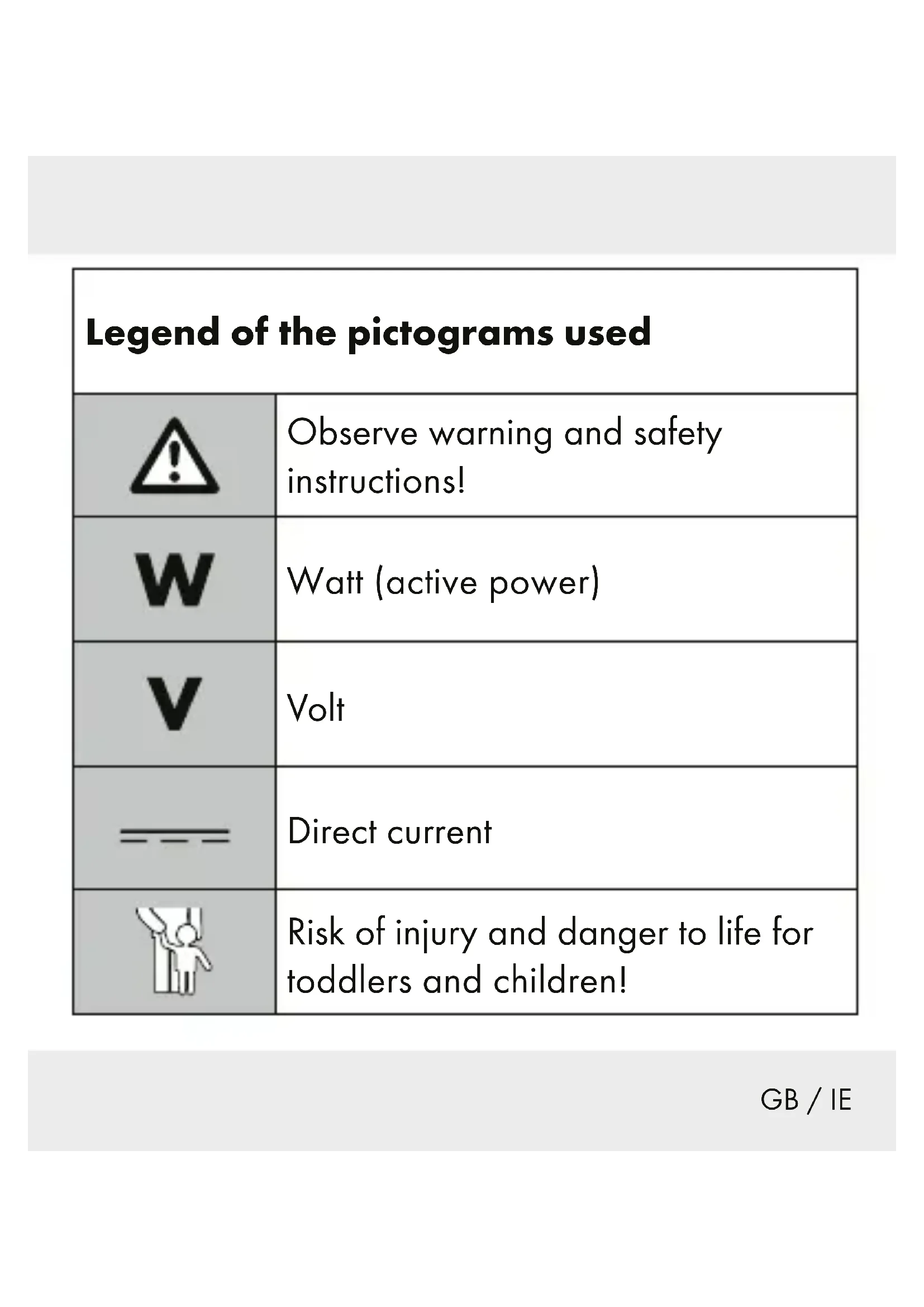 GB / IECHILDREN! Never leave children unattended with the packaging material. There is danger of suffocation. Keep children away from the product. This product may be used by children 8 years of age or older and persons with reduced physical, sensory or mental capabilities or lack of experience and knowledge if they are being supervised or have been instructed in the safe use of the product and understand the hazards that may arise therefrom. Children are not allowed to play with the product. Cleaning and user maintenance must not be performed by children without supervision. Do not use the product if you notice any damage. GB / IE Never expose the product to high temperatures or moisture, because the product may otherwise be damaged. Prevent mechanical stress on the product! In the event of damage, need for repairs or other problems with the product, contact a qualified electrician. ATTENTION! RISK OF OVERHEATING! Do not operate the product in the packaging. Store the product in its packaging after use to prevent accidental damage. GB / IE This product does not contain any parts that can be serviced by the consumer. The LEDs are not interchangeable. If the LEDs fail at the end of their life, the entire product must be replaced. The product must not be electrically connected to any other product. Never connect the product directly to a 230 V connection. This product is only suitable for indoor use, in dry and closed rooms. Safety Instructions for Batteries GB / IE RISK OF DEATH!Keep batteries away from children. In case of swallowing, seek medical attention immediately! RISK OF EXPLOSION! Never recharge non-rechargeable batteries. Do not short-circuit batteries the and/ or do not open them. Overheating, fire hazard or bursting can be the result. Never throw batteries into fire or water. Do not expose the batteries to mechanical stress. Risk of battery leakage Avoid extreme conditions and temperatures that may affect the batteries such as radiators or direct sunlight. GB / IE If the batteries have leaked, avoid contact of skin, eyes and mucous membranes with the chemicals! Rinse affected areas immediately with clear water and seek medical attention! WEAR SAFETY GLOVES! Leaking or damaged batteries can cause chemical burns when in contact with the skin. In this case, wear suitable protective gloves. In the event of battery leakage, remove it immediately from the product to avoid damage. Use only batteries of the same type. Do not mix old batteries with new ones! Remove the batteries if the product will not be used for a long time. GB / IERisk of product damage Only use the specified type of battery! Insert the batteries according to the polarity mark (+) and (-) on the battery and the product. Clean contacts on the battery and in the battery compartment before inserting them! Immediately remove depleted batteries from the product. z Operation Remove the insulating strip from the battery compartment before use