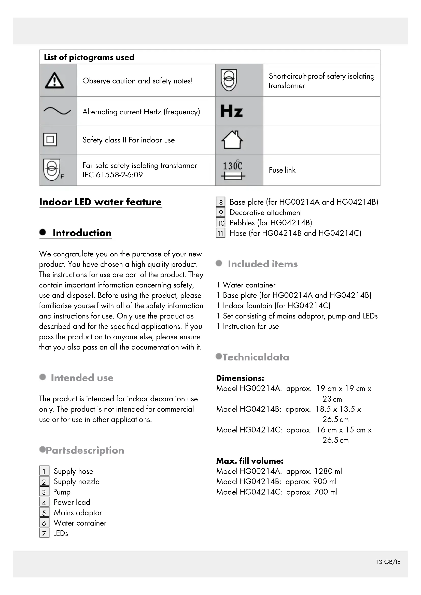 Hose (for HG04214B and HG04214C) Included items 1 Water container 1 Base plate (for HG00214A and HG04214B) 1 Indoor fountain (for HG04214C) 1 Set consisting of mains adaptor, pump and LEDs 1 Instruction for use Technical data Dimensions: Model HG00214A: approx. 19 cm x 19 cm x 23 cm Model HG04214B: approx. 18.5 x 13.5 x