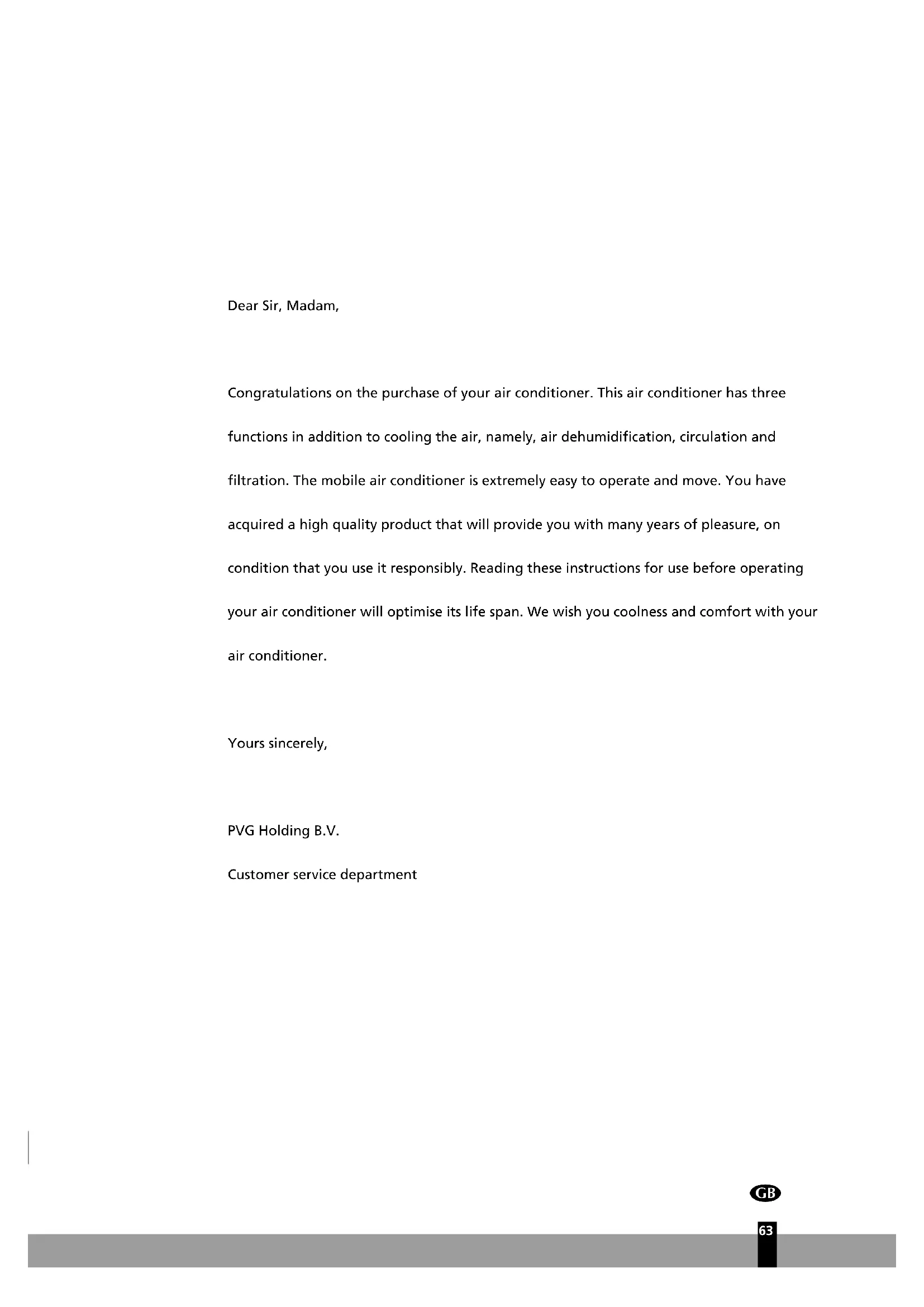 Dear Sir, Madam, Congratulations on the purchase of your air conditioner. This air conditioner has three functions in addition to cooling the air, namely, air dehumidification, circulation and filtration. The mobile air conditioner is extremely easy to operate and move. You have acquired a high quality product that will provide you with many years of pleasure, on condition that you use it responsibly. Reading these instructions for use before operating your air conditioner will optimise its life span. We wish you coolness and comfort with your air conditioner. Yours sincerely, PVG Holding B.V. Customer service department