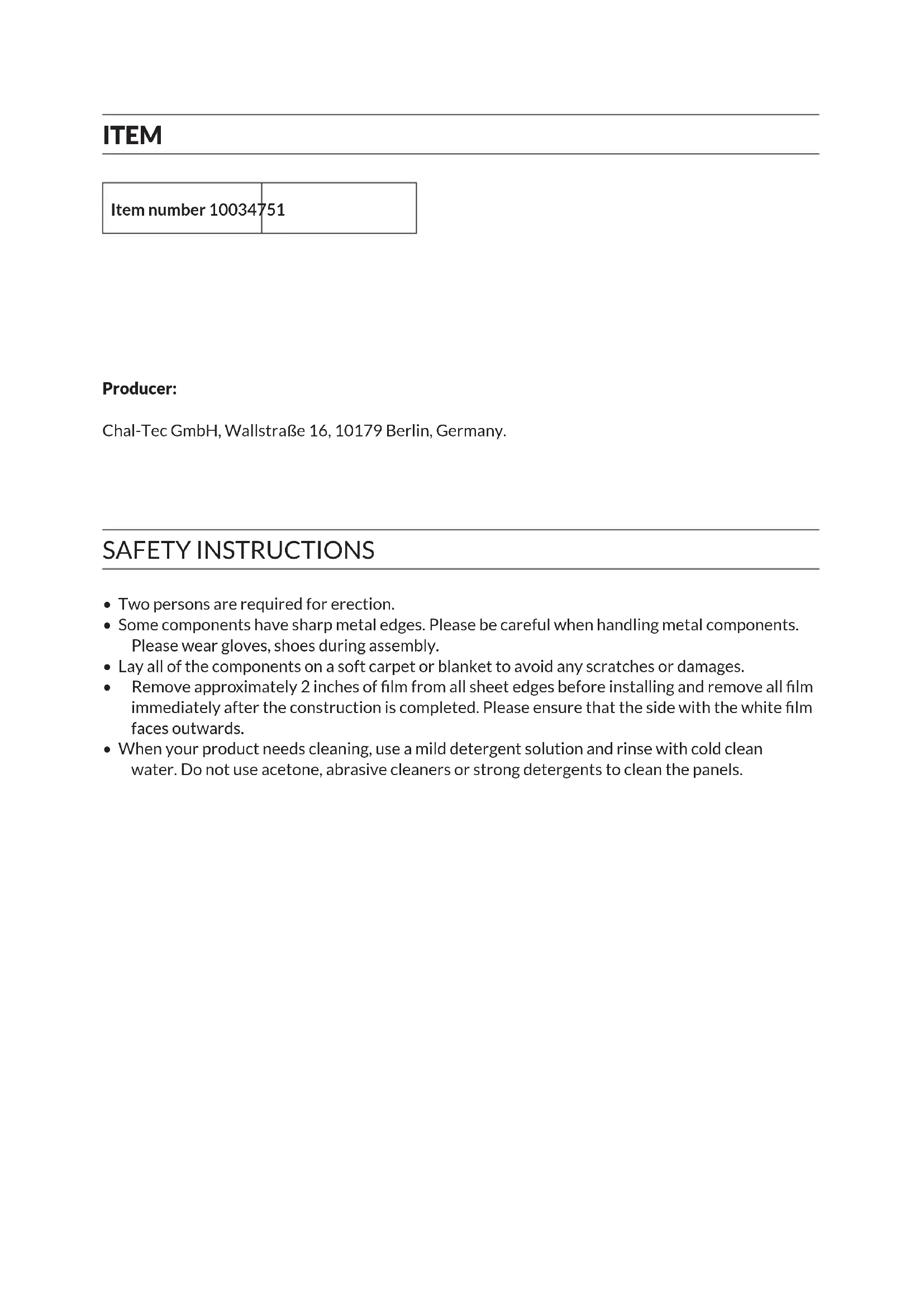 - When your product needs cleaning, use a mild detergent solution and rinse with cold clean water. Do not use acetone, abrasive cleaners or strong detergents to clean the panels. Producer: Chal-Tec GmbH, Wallstraße 16, 10179 Berlin, Germany.ASSEMBLY Tools needed