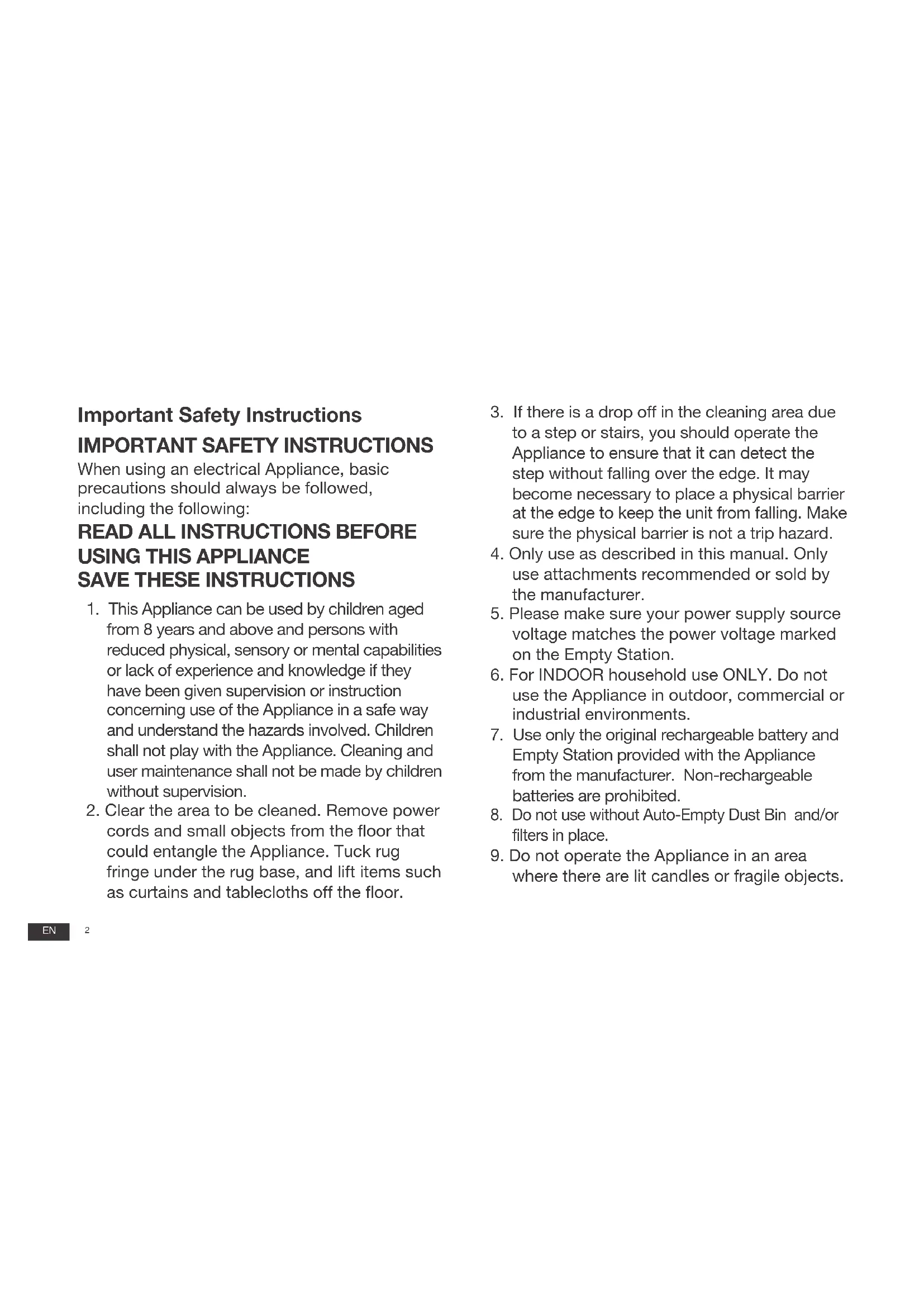 - Use only the original rechargeable battery and Empty Station provided with the Appliance from the manufacturer. Non-rechargeable batteries are prohibited.