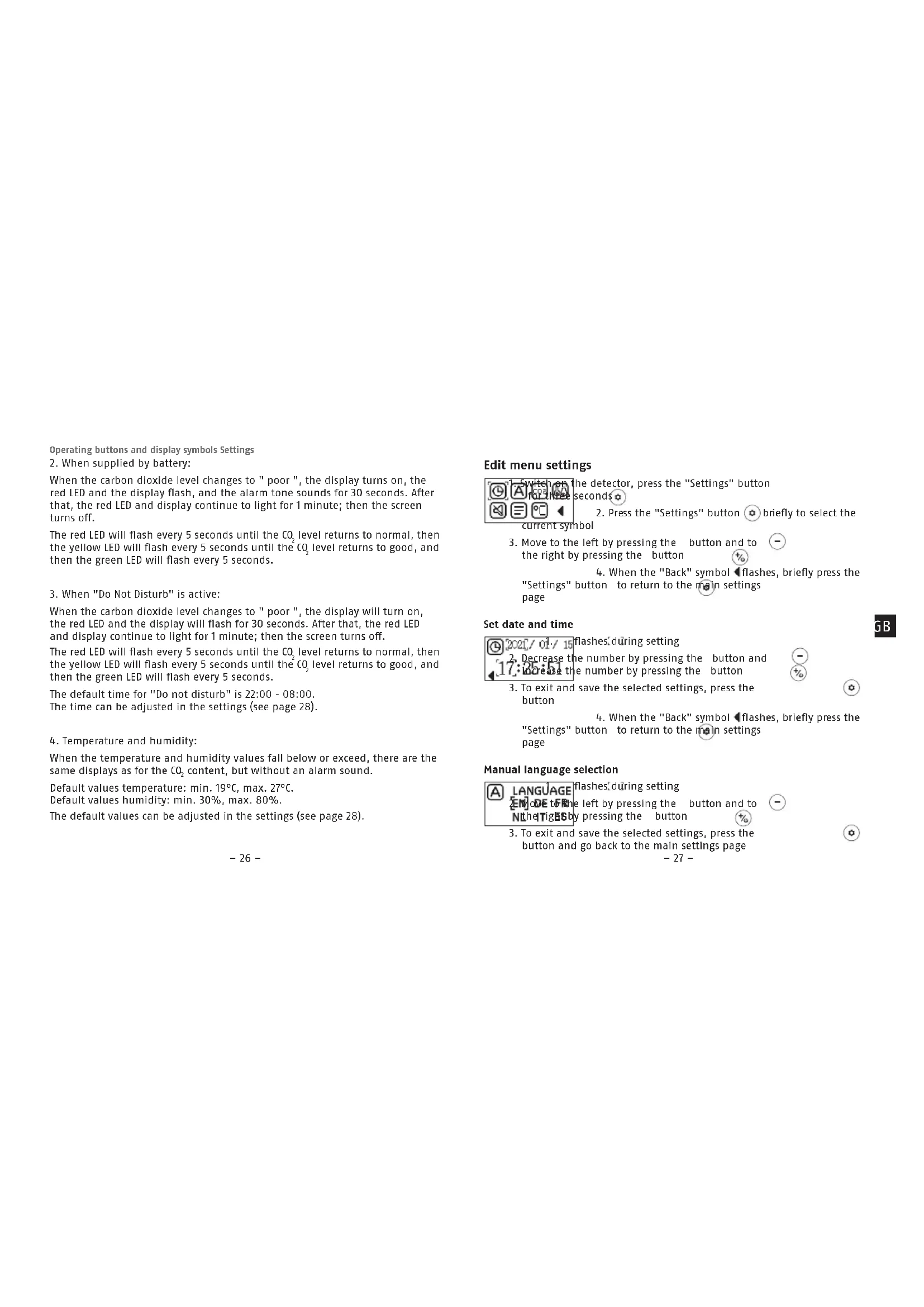 , such as ventilation pipes, chimneys or cars. To calibrate manually, place the detector outdoors and press the three buttons simultaneously. "CO2" will ash during calibration, which lasts approx. 16 minutes until the ashing stops. Calibration is completely automatic. GB– 32 – – 33 – Information on the battery, Warranty Warranty