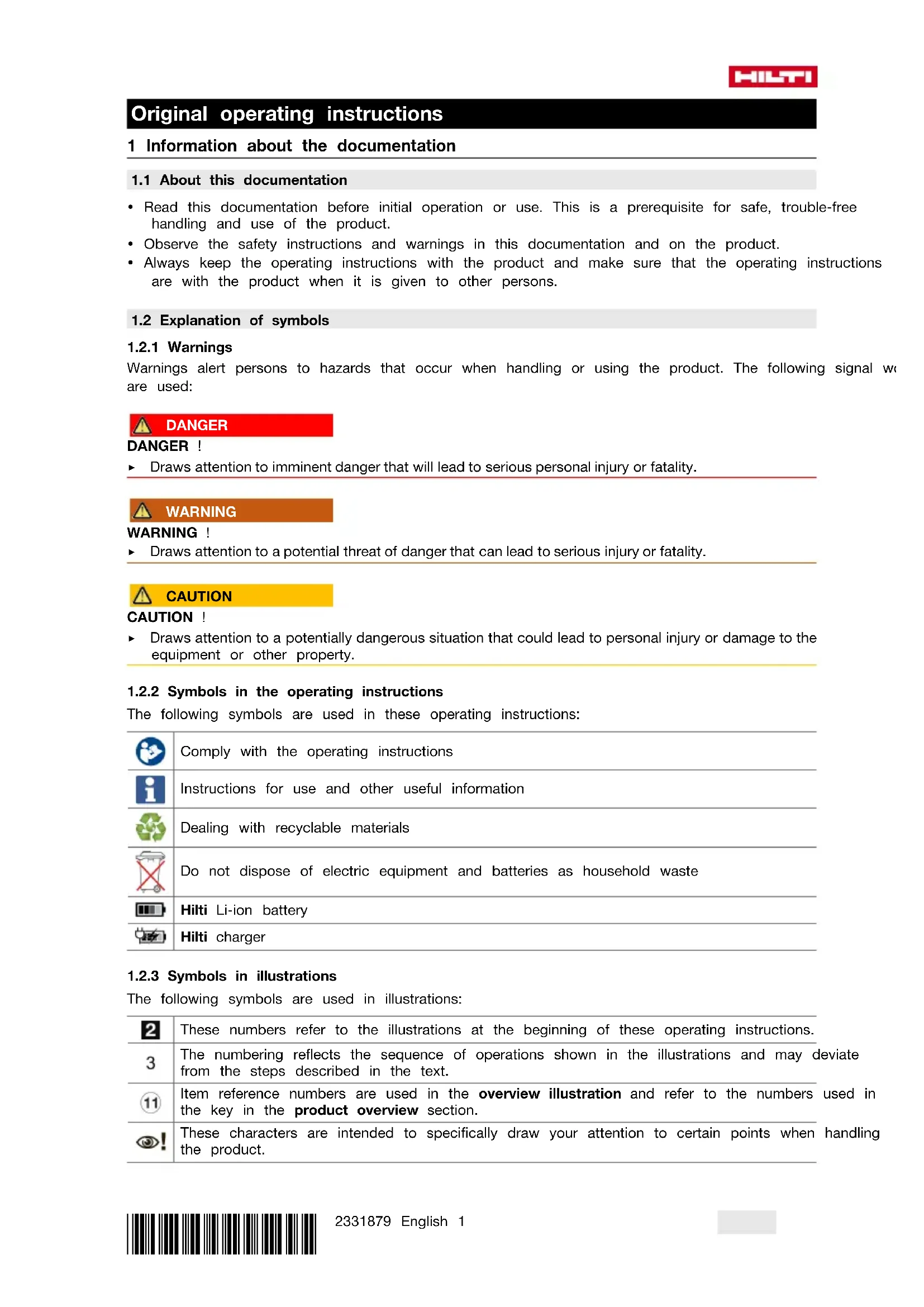 The following symbols are used in these operating instructions: Comply with the operating instructions Instructions for use and other useful information Dealing with recyclable materials Do not dispose of electric equipment and batteries as household waste Hilti Liion battery Hilti charger