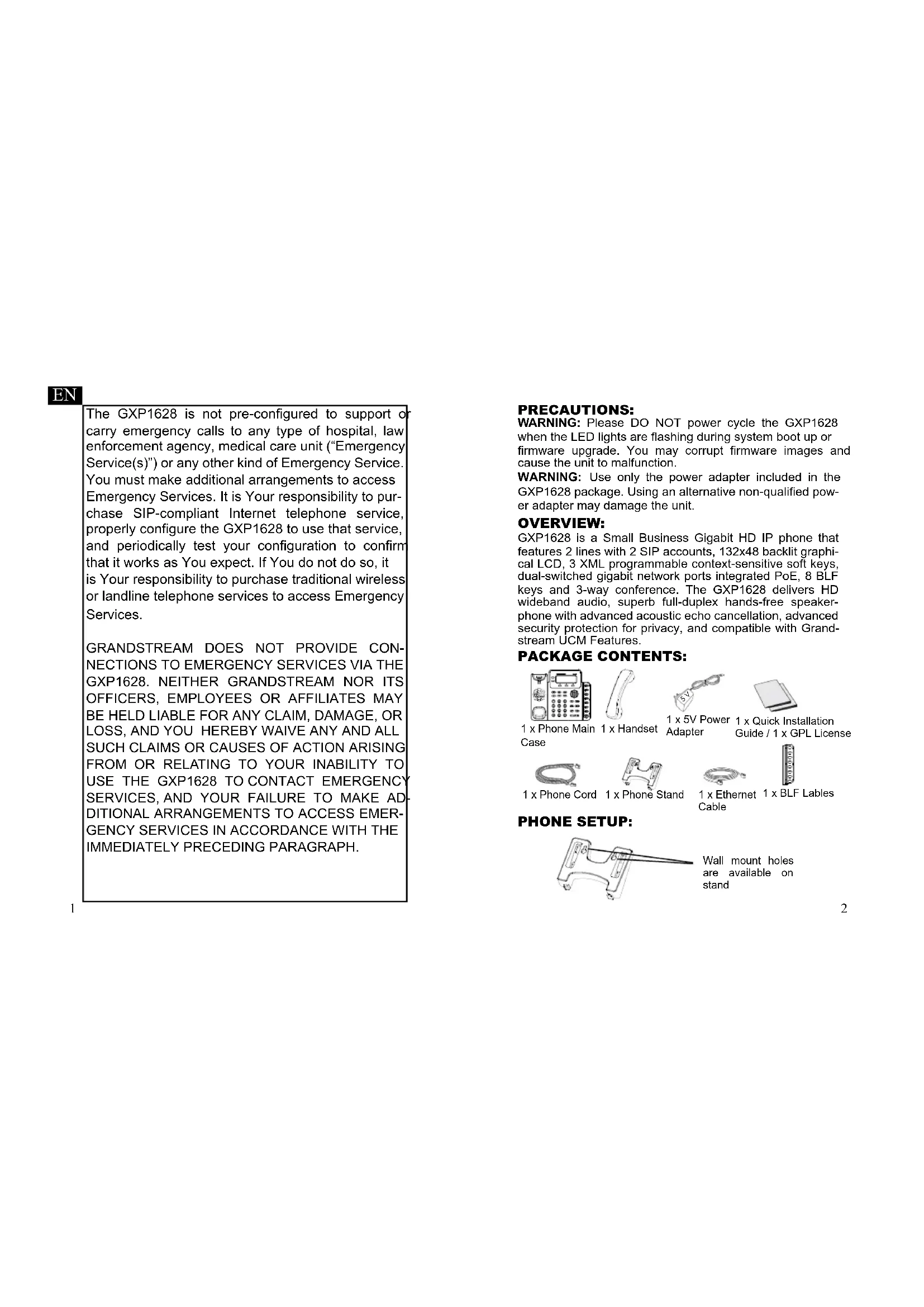 GXP1628 package. Using an alternative non-qualified pow- er adapter may damage the unit. 5 V The GXP1628 is not pre-configured to support or carry emergency calls to any type of hospital, law enforcement agency, medical care unit (“Emergency Service(s)”) or any other kind of Emergency Service. You must make additional arrangements to access Emergency Services. It is Your responsibility to pur- chase SIP-compliant Internet telephone service, properly configure the GXP1628 to use that service, and periodically test your configuration to confirm that it works as You expect. If You do not do so, it is Your responsibility to purchase traditional wireless or landline telephone services to access Emergency Services.