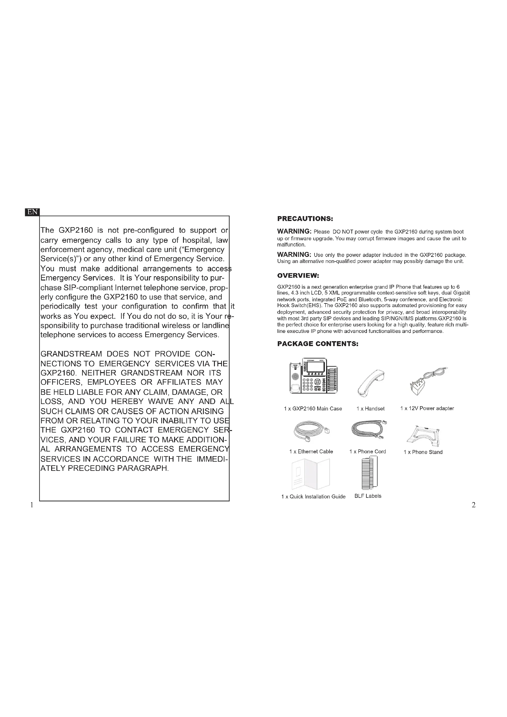up or rmware upgrade. You may corrupt rmware images and cause the unit to malfunction. 1 x GXP2160 Main Case 1 x Handset 1 x Phone Cord1 x Ethernet Cable 1 x Phone Stand 1 x 12V Power adapter GXP2160 is a next generation enterprise grand IP Phone that features up to 6 lines, 4.3 inch LCD, 5 XML programmable context-sensitive soft keys, dual Gigabit network ports, integrated PoE and Bluetooth, 5-way conference, and Electronic Hook Switch(EHS). The GXP2160 also supports automated provisioning for easy deployment, advanced security protection for privacy, and broad interoperability with most 3rd party SIP devices and leading SIP/NGN/IMS platforms.GXP2160 is the perfect choice for enterprise users looking for a high quality, feature rich multi- line executive IP phone with advanced functionalities and performance. PRECAUTIONS: