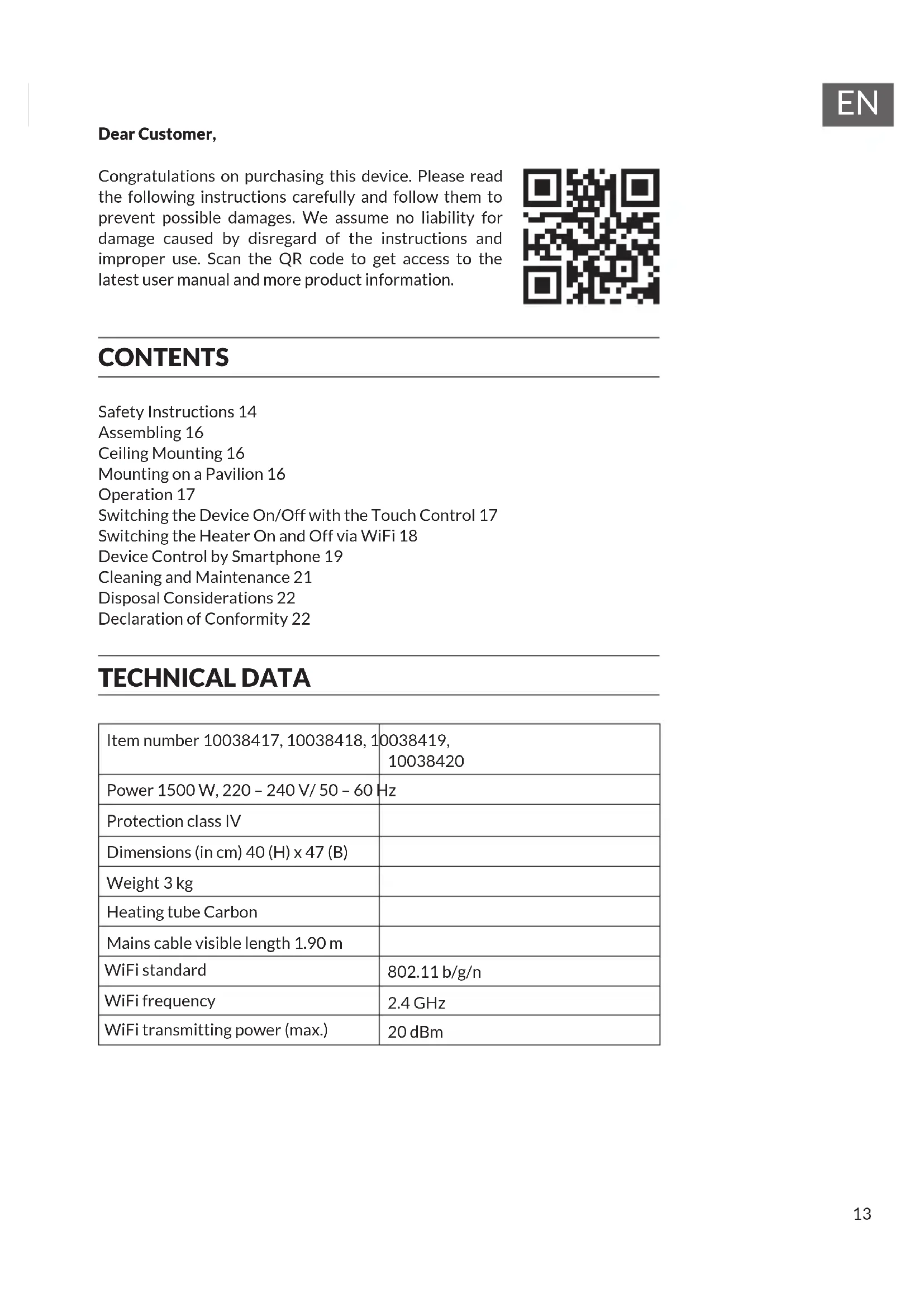 Dear Customer, Congratulations on purchasing this device. Please read the following instructions carefully and follow them to prevent possible damages. We assume no liability for damage caused by disregard of the instructions and improper use. Scan the QR code to get access to the latest user manual and more product information. CONTENTS Safety Instructions 14 Assembling 16 Ceiling Mounting 16 Mounting on a Pavilion 16 Operation 17 Switching the Device On/Off with the Touch Control 17 Switching the Heater On and Off via WiFi 18 Device Control by Smartphone 19 Cleaning and Maintenance 21 Disposal Considerations 22 Declaration of Conformity 22 TECHNICAL DATA Item number 10038417, 10038418, 10038419,