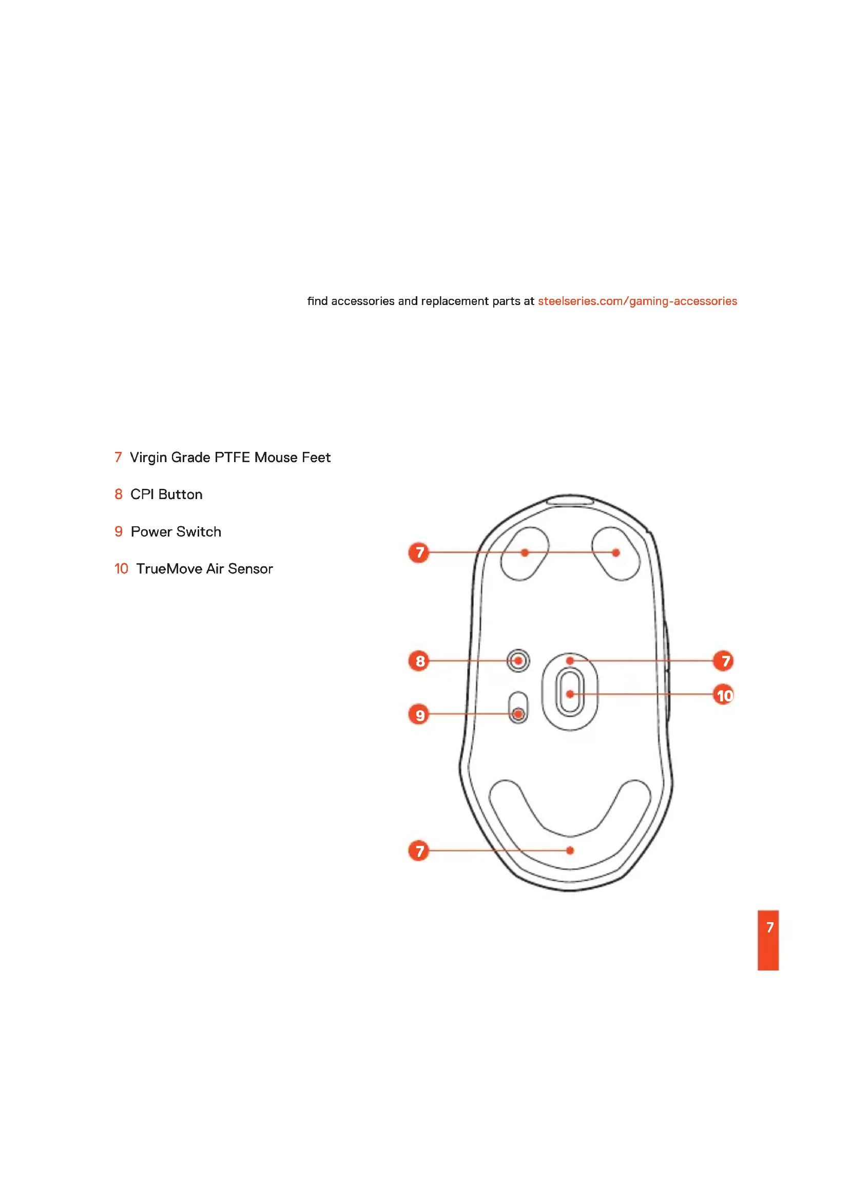 nd accessories and replacement parts at steelseries.com/gaming-accessories 7 Virgin Grade PTFE Mouse Feet 8 CPI Button 9 Power Switch 10 TrueMove Air Sensor4