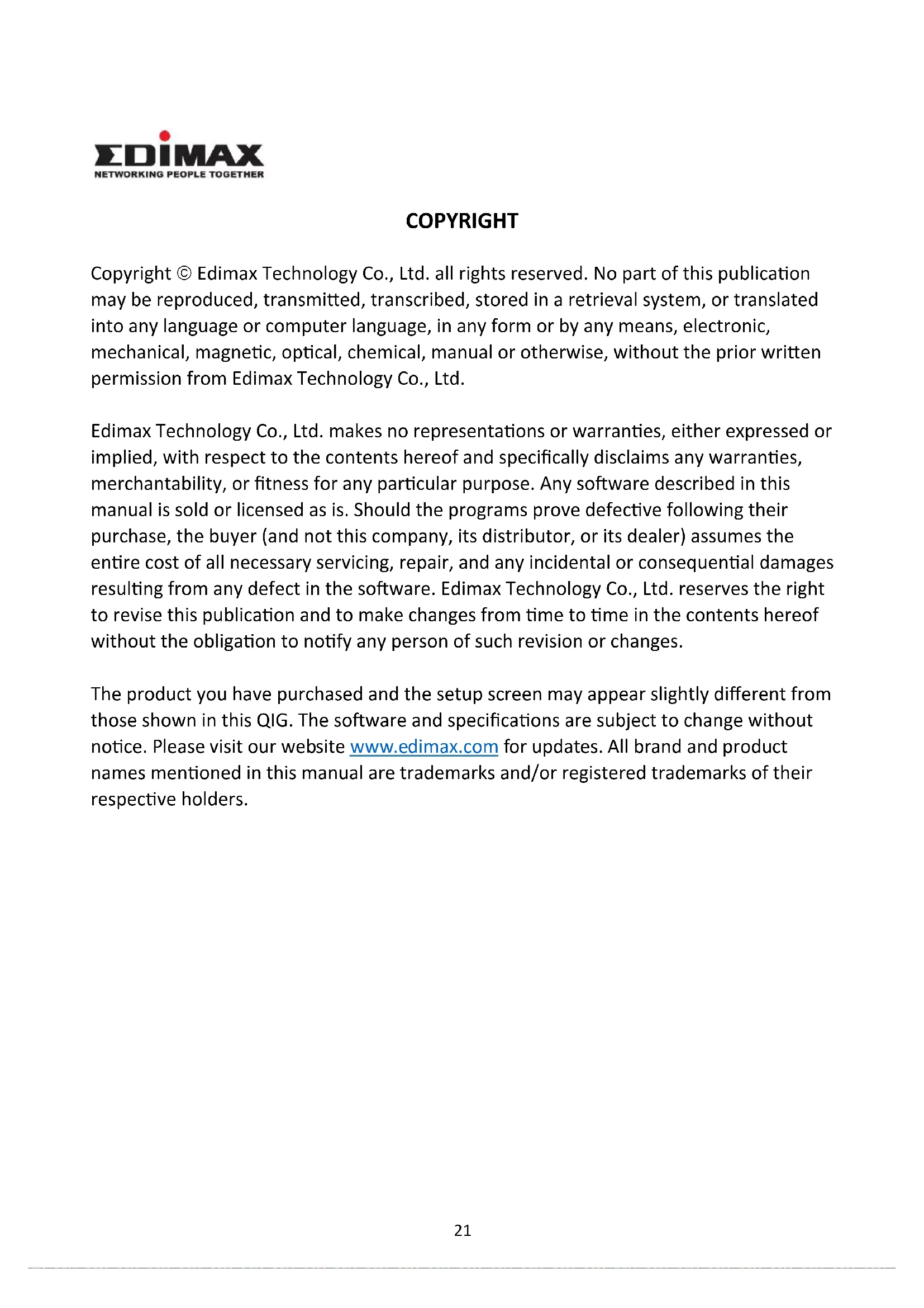 COPYRIGHT Copyright Edimax Technology Co., Ltd. all rights reserved. No part of this publication may be reproduced, transmitted, transcribed, stored in a retrieval system, or translated into any language or computer language, in any form or by any means, electronic, mechanical, magnetic, optical, chemical, manual or otherwise, without the prior written permission from Edimax Technology Co., Ltd. Edimax Technology Co., Ltd. makes no representations or warranties, either expressed or implied, with respect to the contents hereof and specifically disclaims any warranties, merchantability, or fitness for any particular purpose. Any software described in this manual is sold or licensed as is. Should the programs prove defective following their purchase, the buyer (and not this company, its distributor, or its dealer) assumes the entire cost of all necessary servicing, repair, and any incidental or consequential damages resulting from any defect in the software. Edimax Technology Co., Ltd. reserves the right to revise this publication and to make changes from time to time in the contents hereof without the obligation to notify any person of such revision or changes. The product you have purchased and the setup screen may appear slightly different from those shown in this QIG. The software and specifications are subject to change without notice. Please visit our website www.edimax.com for updates. All brand and product names mentioned in this manual are trademarks and/or registered trademarks of their respective holders.22 Federal Communication Commission Interference Statement This equipment has been tested and found to comply with the limits for a Class B digital device, pursuant to Part 15 of FCC Rules. These limits are designed to provide reasonable protection against harmful interference in a residential installation. This equipment generates, uses, and can radiate radio frequency energy and, if not installed and used in accordance with the instructions, may cause harmful interference to radio communications. However, there is no guarantee that interference will not occur in a particular installation. If this equipment does cause harmful interference to radio or television reception, which can be determined by turning the equipment off and on, the user is encouraged to try to correct the interference by one or more of the following measures: