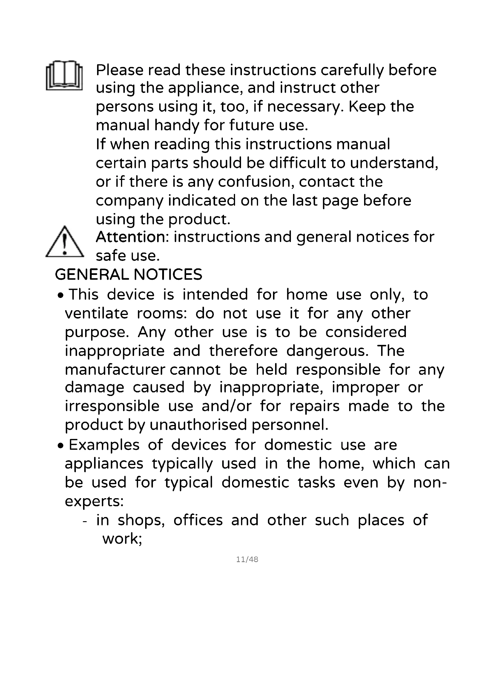 Please read these instructions carefully before using the appliance, and instruct other persons using it, too, if necessary. Keep the manual handy for future use. If when reading this instructions manual certain parts should be difficult to understand, or if there is any confusion, contact the company indicated on the last page before using the product. Attention: instructions and general notices for safe use. GENERAL NOTICES This device is intended for home use only, to ventilate rooms: do not use it for any other purpose. Any other use is to be considered inappropriate and therefore dangerous. The manufacturer cannot be held responsible for any damage caused by inappropriate, improper or irresponsible use and/or for repairs made to the product by unauthorised personnel. Examples of devices for domestic use are appliances typically used in the home, which can be used for typical domestic tasks even by non- experts: - in shops, offices and other such places of work;12/48