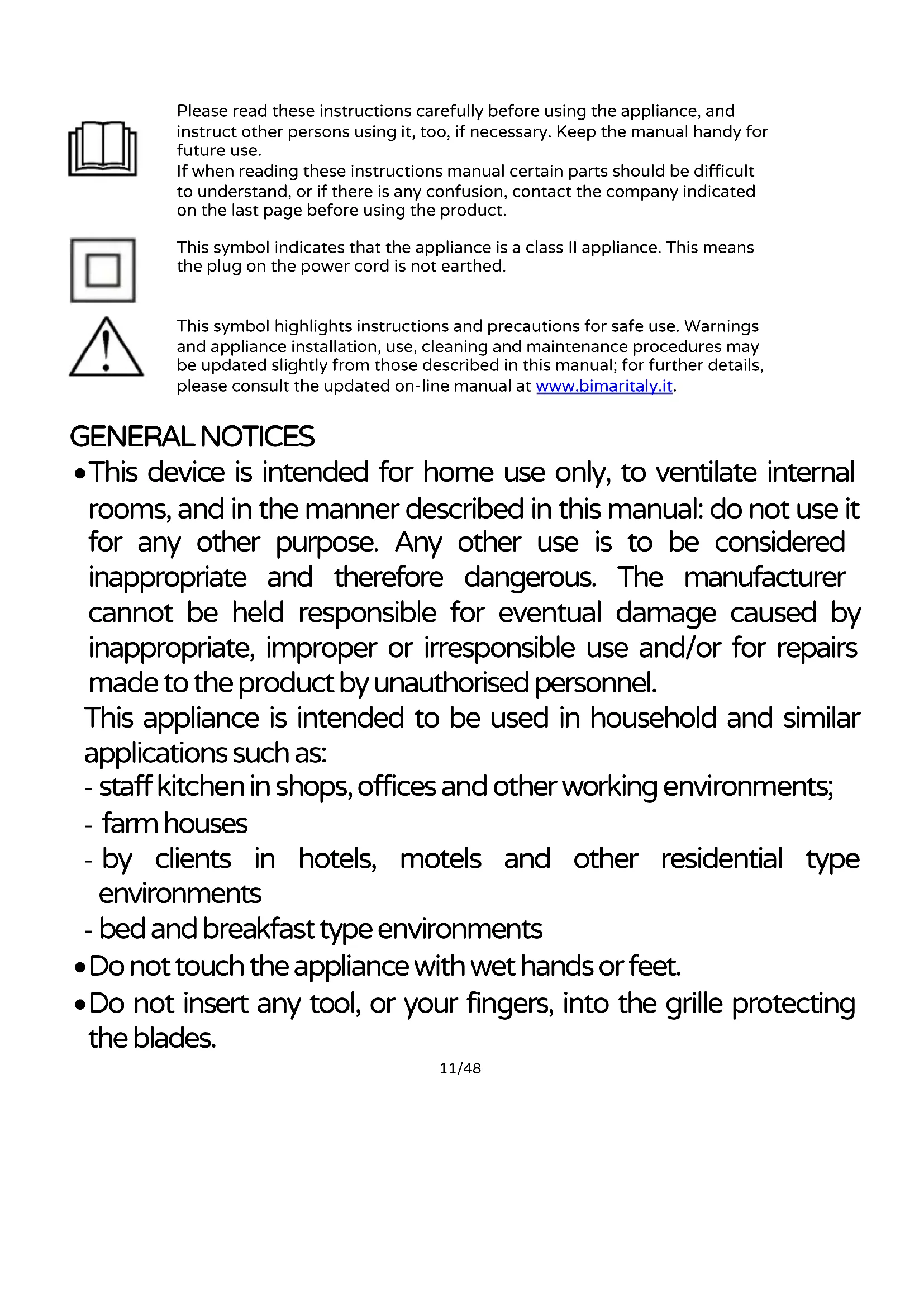 This symbol highlights instructions and precautions for safe use. Warnings and appliance installation, use, cleaning and maintenance procedures may be updated slightly from those described in this manual; for further details, please consult the updated on-line manual at www.bimaritaly.it.