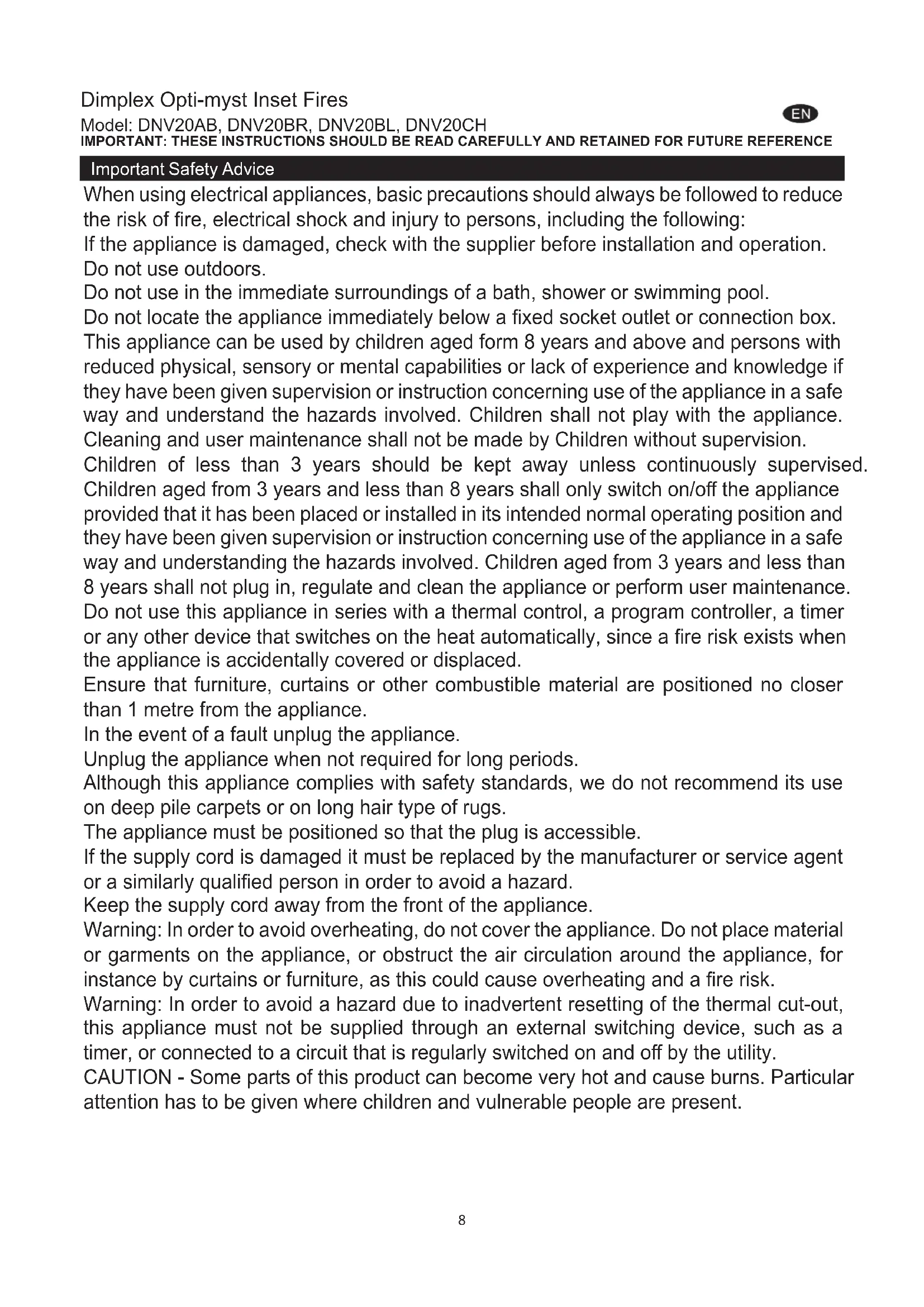 FehlerdiagnoseDimplex Opti-myst Inset Fires Model: DNV20AB, DNV20BR, DNV20BL, DNV20CH IMPORTANT: THESE INSTRUCTIONS SHOULD BE READ CAREFULLY AND RETAINED FOR FUTURE REFERENCE When using electrical appliances, basic precautions should always be followed to reduce the risk of re, electrical shock and injury to persons, including the following: If the appliance is damaged, check with the supplier before installation and operation. Do not use outdoors. Do not use in the immediate surroundings of a bath, shower or swimming pool. Do not locate the appliance immediately below a xed socket outlet or connection box. This appliance can be used by children aged form 8 years and above and persons with reduced physical, sensory or mental capabilities or lack of experience and knowledge if they have been given supervision or instruction concerning use of the appliance in a safe way and understand the hazards involved. Children shall not play with the appliance. Cleaning and user maintenance shall not be made by Children without supervision. Children of less than 3 years should be kept away unless continuously supervised. Children aged from 3 years and less than 8 years shall only switch on/o the appliance provided that it has been placed or installed in its intended normal operating position and they have been given supervision or instruction concerning use of the appliance in a safe way and understanding the hazards involved. Children aged from 3 years and less than 8 years shall not plug in, regulate and clean the appliance or perform user maintenance. Do not use this appliance in series with a thermal control, a program controller, a timer or any other device that switches on the heat automatically, since a re risk exists when the appliance is accidentally covered or displaced. Ensure that furniture, curtains or other combustible material are positioned no closer than 1 metre from the appliance. In the event of a fault unplug the appliance. Unplug the appliance when not required for long periods. Although this appliance complies with safety standards, we do not recommend its use on deep pile carpets or on long hair type of rugs. The appliance must be positioned so that the plug is accessible. If the supply cord is damaged it must be replaced by the manufacturer or service agent or a similarly qualied person in order to avoid a hazard. Keep the supply cord away from the front of the appliance.