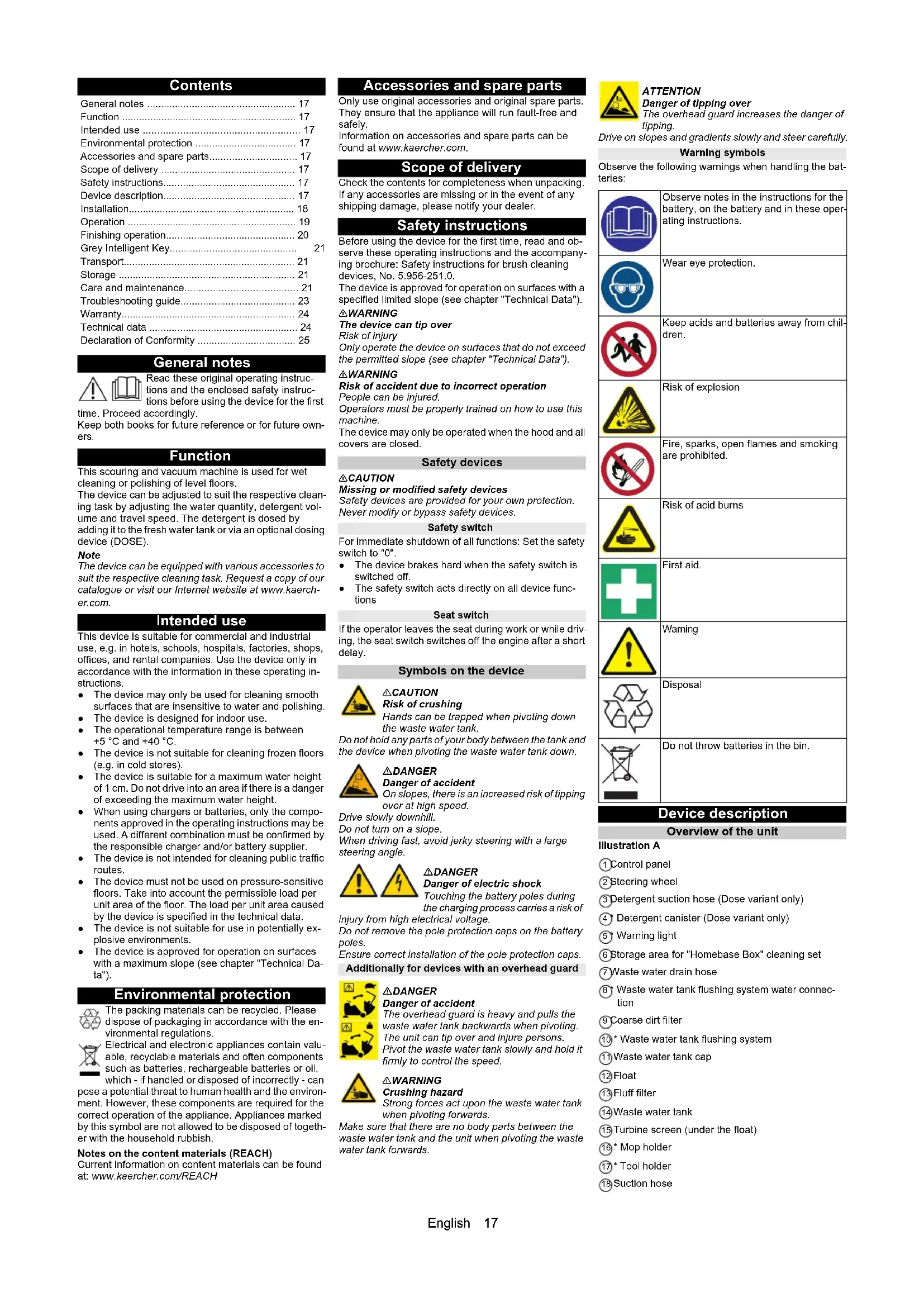 - ) - - 2943 (30) 2943 (30) - R 75 D 75 R 85 D 90 D 110English 17 Contents General notes Read these original operating instruc- tions and the enclosed safety instruc- tions before using the device for the first time. Proceed accordingly. Keep both books for future reference or for future own- ers. Function This scouring and vacuum machine is used for wet cleaning or polishing of level floors. The device can be adjusted to suit the respective clean- ing task by adjusting the water quantity, detergent vol- ume and travel speed. The detergent is dosed by adding it to the fresh water tank or via an optional dosing device (DOSE). Note The device can be equipped with various accessories to suit the respective cleaning task. Request a copy of our catalogue or visit our Internet website at www.kaerch- er.com. Intended use This device is suitable for commercial and industrial use, e.g. in hotels, schools, hospitals, factories, shops, offices, and rental companies. Use the device only in accordance with the information in these operating in- structions. ● The device may only be used for cleaning smooth surfaces that are insensitive to water and polishing. ● The device is designed for indoor use. ● The operational temperature range is between +5 °C and +40 °C. ● The device is not suitable for cleaning frozen floors (e.g. in cold stores). ● The device is suitable for a maximum water height of 1 cm. Do not drive into an area if there is a danger of exceeding the maximum water height. ● When using chargers or batteries, only the compo- nents approved in the operating instructions may be used. A different combination must be confirmed by the responsible charger and/or battery supplier. ● The device is not intended for cleaning public traffic routes. ● The device must not be used on pressure-sensitive floors. Take into account the permissible load per unit area of the floor. The load per unit area caused by the device is specified in the technical data. ● The device is not suitable for use in potentially ex- plosive environments. ● The device is approved for operation on surfaces with a maximum slope (see chapter "Technical Da- ta"). Environmental protection The packing materials can be recycled. Please dispose of packaging in accordance with the en- vironmental regulations. Electrical and electronic appliances contain valu- able, recyclable materials and often components such as batteries, rechargeable batteries or oil, which - if handled or disposed of incorrectly - can pose a potential threat to human health and the environ- ment. However, these components are required for the correct operation of the appliance. Appliances marked by this symbol are not allowed to be disposed of togeth- er with the household rubbish. Notes on the content materials (REACH) Current information on content materials can be found at: www.kaercher.com/REACH Accessories and spare parts Only use original accessories and original spare parts. They ensure that the appliance will run fault-free and safely. Information on accessories and spare parts can be found at www.kaercher.com. Scope of delivery Check the contents for completeness when unpacking. If any accessories are missing or in the event of any shipping damage, please notify your dealer. Safety instructions Before using the device for the first time, read and ob- serve these operating instructions and the accompany- ing brochure: Safety instructions for brush cleaning devices, No. 5.956-251.0. The device is approved for operation on surfaces with a specified limited slope (see chapter "Technical Data"). 몇 WARNING The device can tip over Risk of injury Only operate the device on surfaces that do not exceed the permitted slope (see chapter "Technical Data"). 몇 WARNING Risk of accident due to incorrect operation People can be injured. Operators must be properly trained on how to use this machine. The device may only be operated when the hood and all covers are closed. Safety devices 몇 CAUTION Missing or modified safety devices Safety devices are provided for your own protection. Never modify or bypass safety devices. Safety switch For immediate shutdown of all functions: Set the safety switch to "0". ● The device brakes hard when the safety switch is switched off. ● The safety switch acts directly on all device func- tions Seat switch If the operator leaves the seat during work or while driv- ing, the seat switch switches off the engine after a short delay. Symbols on the device 몇CAUTION Risk of crushing Hands can be trapped when pivoting down the waste water tank. Do not hold any parts of your body between the tank and the device when pivoting the waste water tank down. DANGER Danger of accident On slopes, there is an increased risk of tipping over at high speed. Drive slowly downhill. Do not turn on a slope. When driving fast, avoid jerky steering with a large steering angle. DANGER Danger of electric shock Touching the battery poles during the charging process carries a risk of injury from high electrical voltage. Do not remove the pole protection caps on the battery poles. Ensure correct installation of the pole protection caps. Additionally for devices with an overhead guard DANGER Danger of accident The overhead guard is heavy and pulls the waste water tank backwards when pivoting. The unit can tip over and injure persons. Pivot the waste water tank slowly and hold it firmly to control the speed. 몇WARNING Crushing hazard Strong forces act upon the waste water tank when pivoting forwards. Make sure that there are no body parts between the waste water tank and the unit when pivoting the waste water tank forwards. ATTENTION Danger of tipping over The overhead guard increases the danger of tipping. Drive on slopes and gradients slowly and steer carefully. Warning symbols Observe the following warnings when handling the bat- teries: Device description Overview of the unit Illustration A 1 Control panel 2 Steering wheel 3 Detergent sucti