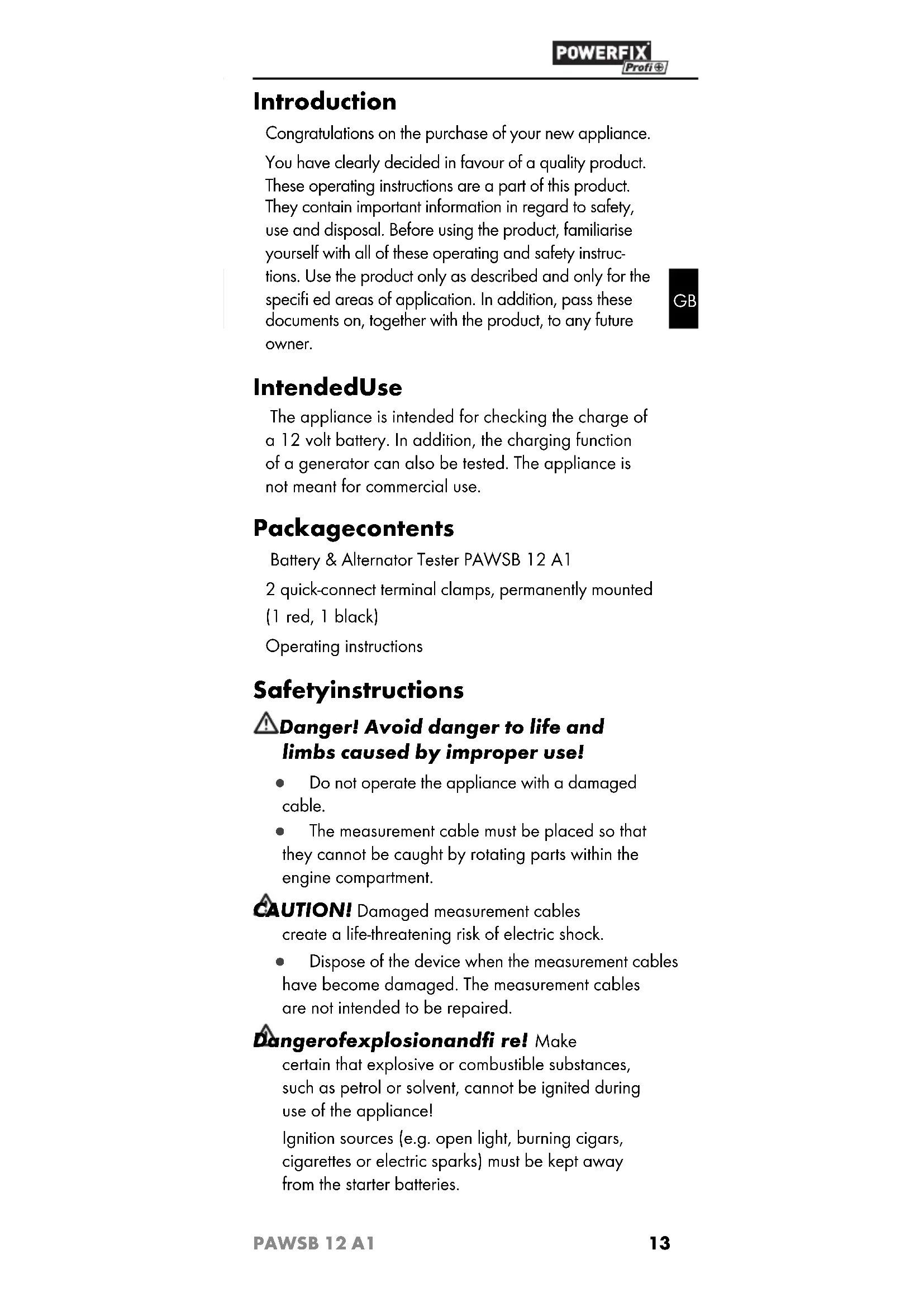 PAWSB 12 A1 Introduction Congratulations on the purchase of your new appliance. You have clearly decided in favour of a quality product. These operating instructions are a part of this product. They contain important information in regard to safety, use and disposal. Before using the product, familiarise yourself with all of these operating and safety instruc- tions. Use the product only as described and only for the specifi ed areas of application. In addition, pass these documents on, together with the product, to any future owner. Intended Use The appliance is intended for checking the charge of a 12 volt battery. In addition, the charging function of a generator can also be tested. The appliance is not meant for commercial use. Package contents Battery & Alternator Tester PAWSB 12 A1 2 quick-connect terminal clamps, permanently mounted (1 red, 1 black) Operating instructions Safety instructions Danger! Avoid danger to life and limbs caused by improper use! ● Do not operate the appliance with a damaged cable. ● The measurement cable must be placed so that they cannot be caught by rotating parts within the engine compartment. CAUTION! Damaged measurement cables create a life-threatening risk of electric shock. ● Dispose of the device when the measurement cables have become damaged. The measurement cables are not intended to be repaired. Danger of explosion and fi re! Make certain that explosive or combustible substances, such as petrol or solvent, cannot be ignited during use of the appliance! Ignition sources (e.g. open light, burning cigars, cigarettes or electric sparks) must be kept away from the starter batteries. IB_78533_PAWSB12A1_LB2.indd 13IB_78533_PAWSB12A1_LB2.indd 13 13.08.12 15:3113.08.12 15:31GB