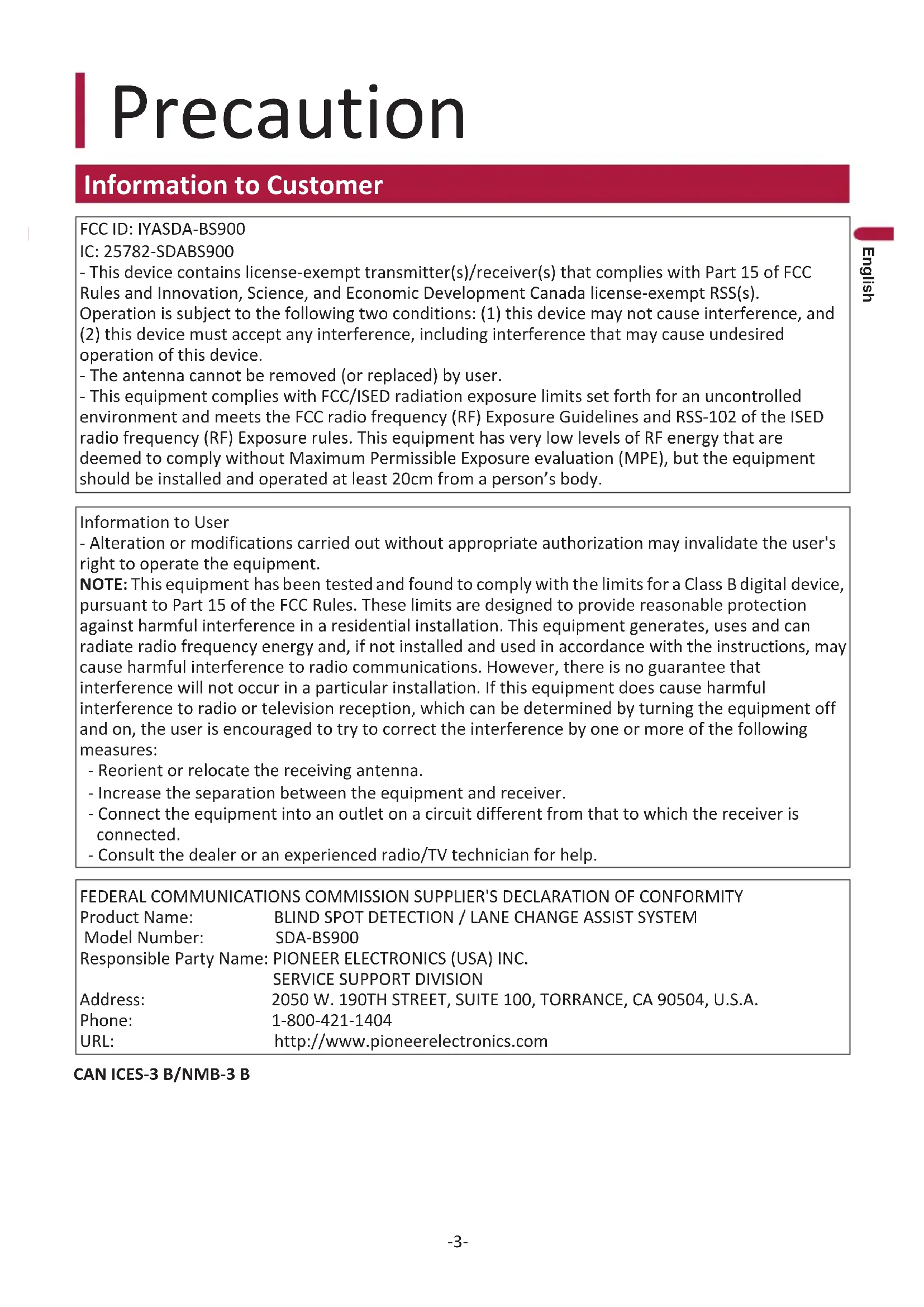 IYASDA-BS900 The antenna cannot be removed (or replaced) by user. This equipment complies with FCC/ISED radiation exposure limits set forth for an uncontrolled environment and meets the FCC radio frequency (RF) Exposure Guidelines and RSS-102 of the ISED radio frequency (RF) Exposure rules. This equipment has very low levels of RF energy that are deemed to comply without Maximum Permissible Exposure evaluation (MPE), but the equipment should be installed and operated at least 20cm from a person’s body. Information to User - Alteration or modifications carried out without appropriate authorization may invalidate the user's right to operate the equipment. NOTE: This equipment has been tested and found to comply with the limits for a Class B digital device, pursuant to Part 15 of the FCC Rules. These limits are designed to provide reasonable protection against harmful interference in a residential installation. This equipment generates, uses and can radiate radio frequency energy and, if not installed and used in accordance with the instructions, may cause harmful interference to radio communications. However, there is no guarantee that interference will not occur in a particular installation. If this equipment does cause harmful interference to radio or television reception, which can be determined by turning the equipment off and on, the user is encouraged to try to correct the interference by one or more of the following measures: - Reorient or relocate the receiving antenna. - Increase the separation between the equipment and receiver. - Connect the equipment into an outlet on a circuit different from that to which the receiver is connected. - Consult the dealer or an experienced radio/TV technician for help. FEDERAL COMMUNICATIONS COMMISSION SUPPLIER'S DECLARATION OF CONFORMITY Product Name: Model Number: SDA-BS900 Responsible Party Name: PIONEER ELECTRONICS (USA) INC.