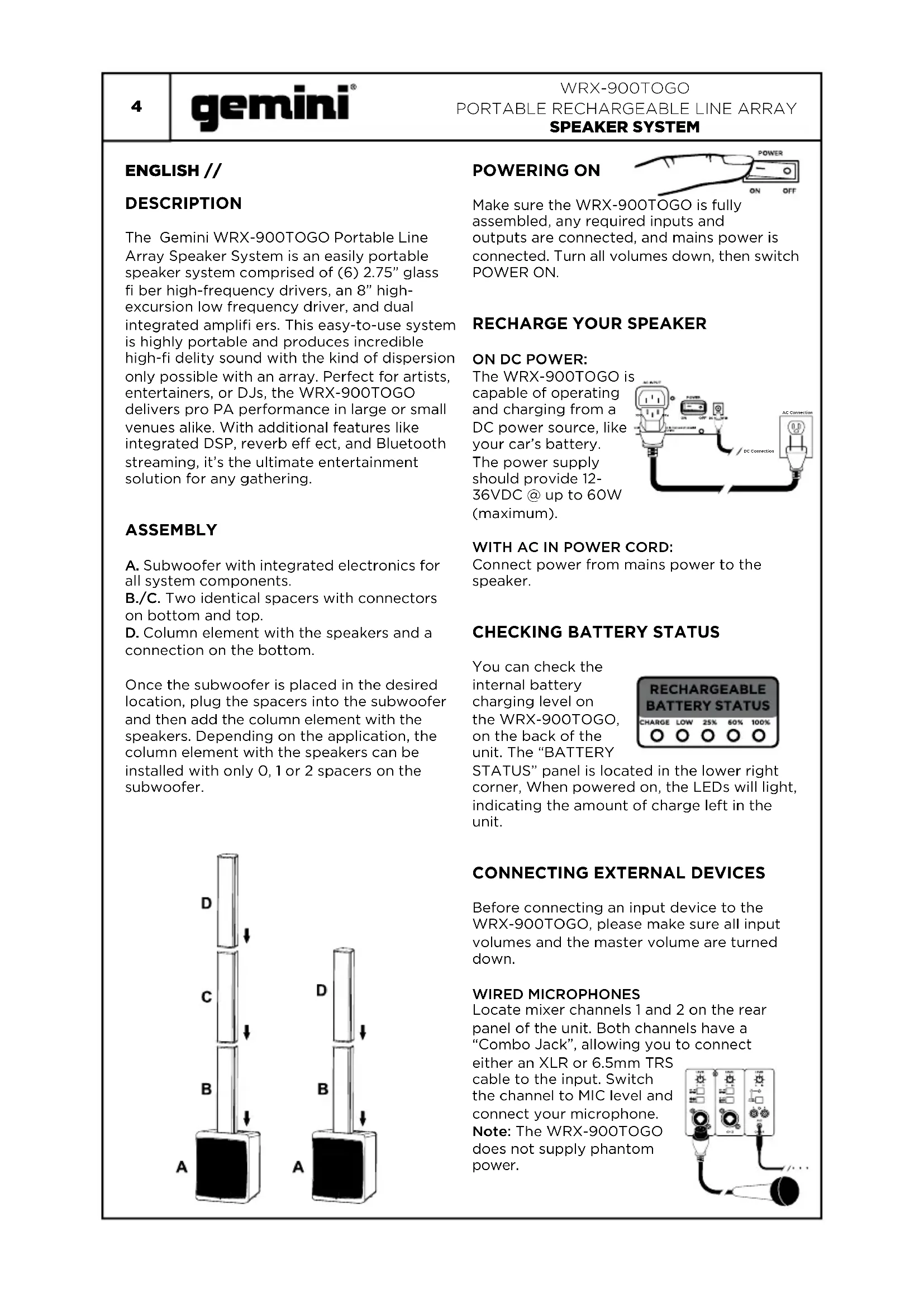 SPEAKER SYSTEM ENGLISH // DESCRIPTION The Gemini WRX-900TOGO Portable Line Array Speaker System is an easily portable speaker system comprised of (6) 2.75” glass fi ber high-frequency drivers, an 8” high- excursion low frequency driver, and dual integrated amplifi ers. This easy-to-use system is highly portable and produces incredible high-fi delity sound with the kind of dispersion only possible with an array. Perfect for artists, entertainers, or DJs, the WRX-900TOGO delivers pro PA performance in large or small venues alike. With additional features like integrated DSP, reverb eff ect, and Bluetooth streaming, it’s the ultimate entertainment solution for any gathering. ASSEMBLY A. Subwoofer with integrated electronics for all system components. B./C. Two identical spacers with connectors on bottom and top. D. Column element with the speakers and a connection on the bottom. Once the subwoofer is placed in the desired location, plug the spacers into the subwoofer and then add the column element with the speakers. Depending on the application, the column element with the speakers can be installed with only 0, 1 or 2 spacers on the subwoofer. POWERING ON Make sure the WRX-900TOGO is fully assembled, any required inputs and outputs are connected, and mains power is connected. Turn all volumes down, then switch POWER ON.