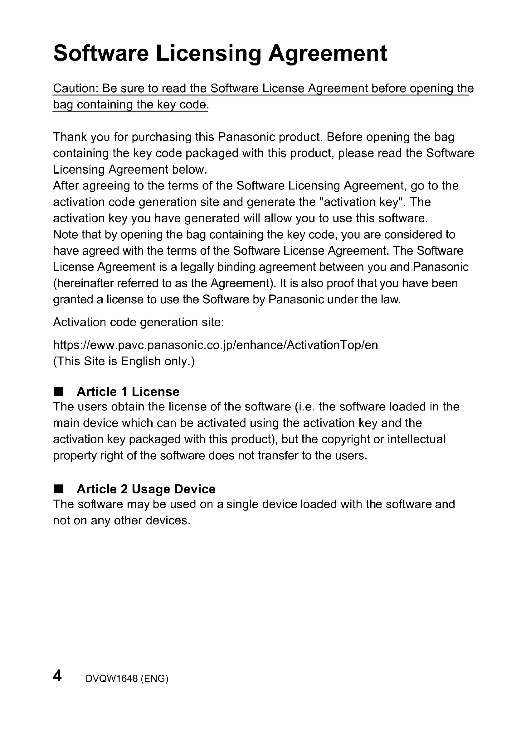 Software Licensing Agreement Caution: Be sure to read the Software License Agreement before opening the bag containing the key code. Thank you for purchasing this Panasonic product. Before opening the bag containing the key code packaged with this product, please read the Software Licensing Agreement below. After agreeing to the terms of the Software Licensing Agreement, go to the activation code generation site and generate the "activation key". The activation key you have generated will allow you to use this software. Note that by opening the bag containing the key code, you are considered to have agreed with the terms of the Software License Agreement. The Software License Agreement is a legally binding agreement between you and Panasonic (hereinafter referred to as the Agreement). It is also proof that you have been granted a license to use the Software by Panasonic under the law. Activation code generation site: ∫ Article 1 License The users obtain the license of the software (i.e. the software loaded in the main device which can be activated using the activation key and the activation key packaged with this product), but the copyright or intellectual property right of the software does not transfer to the users. ∫ Article 2 Usage Device The software may be used on a single device loaded with the software and not on any other devices. https://eww.pavc.panasonic.co.jp/enhance/ActivationTop/en (This Site is English only.) DMC-SFU2-DVQW1648.book 4 ページ 2022年3月8日 火曜日 午後6時8分5 (ENG) DVQW1648 ENGLISH ∫ Article 3 Reverse Engineering, Decompiling or Disassembly The Software is provided to you as is, and Panasonic makes no express or implied warranties whatsoever with respect to the Software. You may not reverse engineer, decompile, or disassemble the Software. Panasonic or any of its distributors or dealers shall not be bound by warranty for any defects in the Software or damage to you caused by your reverse engineering, decompiling, or disassembly of the Software. ∫ Article 4 Indemnification Panasonic or any of its distributors or dealers shall not be liable for any damage suffered by Licensee, either directly or through claims from a third party, arising from or in connection with Licensee’s use of the Software. Furthermore, Panasonic does not guarantee the successful operation of the software unless it is used with any of Panasonic. ∫ Article 5 Changes to Specifications Panasonic may change the information in the specifications and related documents for the Software without prior notice in the future. ∫ Article 6 Export Control You shall comply with all laws and regulations related to export control at home and abroad with respect to the Software. ∫ Article 7 Legal system This document shall be governed by and construed and enforced in accordance with the laws of Japan, without regard to its conflict of law provisions. ∫ Article 8 Conflict resolution Any dispute arising out of or in relation to this document shall be subject to the exclusive jurisdiction of the Osaka District Court. Please note the following.