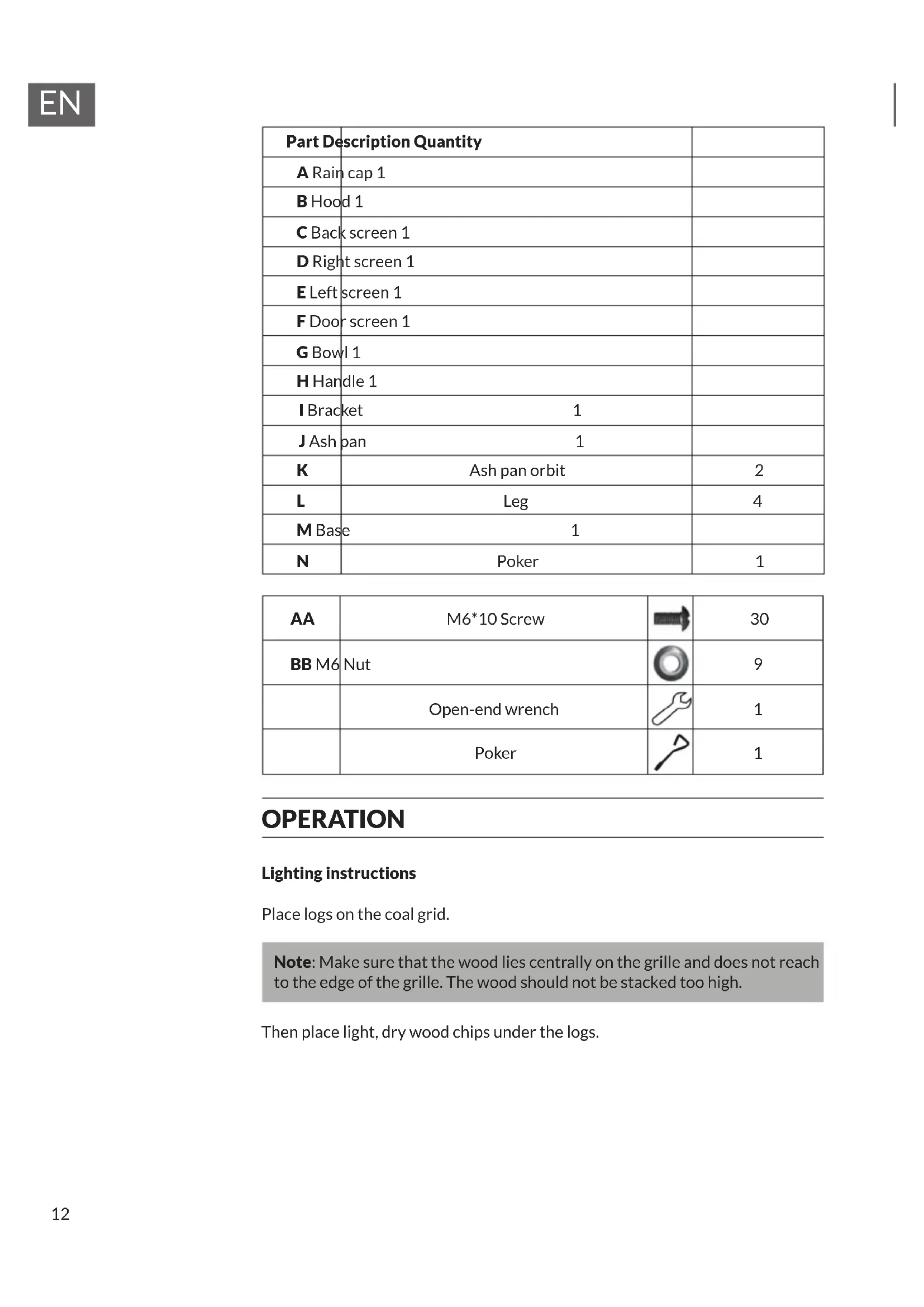 OPERATION Lighting instructions Place logs on the coal grid. Note: Make sure that the wood lies centrally on the grille and does not reach to the edge of the grille. The wood should not be stacked too high. Then place light, dry wood chips under the logs.13