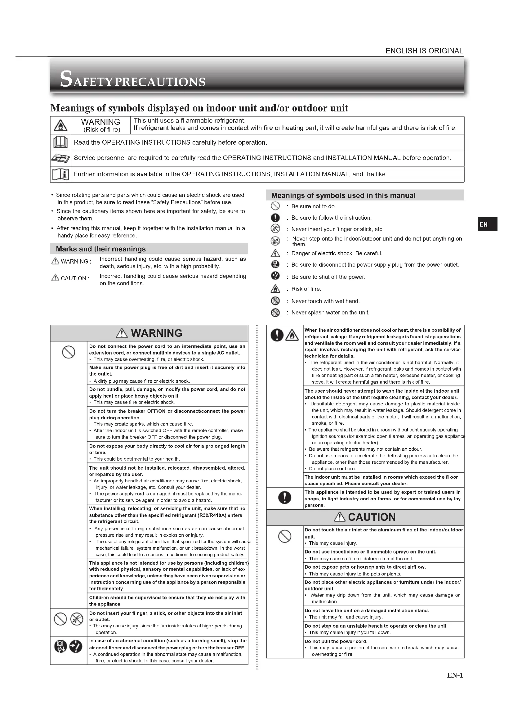 - Since rotating parts and parts which could cause an electric shock are used in this product, be sure to read these “Safety Precautions” before use.• Since the cautionary items shown here are important for safety, be sure to observe them.• After reading this manual, keep it together with the installation manual in a handy place for easy reference. Marks and their meanings WARNING :Incorrect handling could cause serious hazard, such as death, serious injury, etc. with a high probability. CAUTION :Incorrect handling could cause serious hazard depending on the conditions. Meanings of symbols used in this manual : Be sure not to do. : Be sure to follow the instruction. : Never insert your fi nger or stick, etc. : Never step onto the indoor/outdoor unit and do not put anything on them. : Danger of electric shock. Be careful. : Be sure to disconnect the power supply plug from the power outlet. : Be sure to shut off the power. : Risk of fi re. : Never touch with wet hand. : Never splash water on the unit. SAFETY PRECAUTIONS Meanings of symbols displayed on indoor unit and/or outdoor unit WARNING (Risk of fi re)This unit uses a fl ammable refrigerant. If refrigerant leaks and comes in contact with fi re or heating part, it will create harmful gas and there is risk of fi re. Read the OPERATING INSTRUCTIONS carefully before operation.Service personnel are required to carefully read the OPERATING INSTRUCTIONS and INSTALLATION MANUAL before operation.Further information is available in the OPERATING INSTRUCTIONS, INSTALLATION MANUAL, and the like. WARNING Do not connect the power cord to an intermediate point, use an extension cord, or connect multiple devices to a single AC outlet.• This may cause overheating, fi re, or electric shock.Make sure the power plug is free of dirt and insert it securely into the outlet.• A dirty plug may cause fi re or electric shock.Do not bundle, pull, damage, or modify the power cord, and do not apply heat or place heavy objects on it.• This may cause fi re or electric shock.Do not turn the breaker OFF/ON or disconnect/connect the power plug during operation.• This may create sparks, which can cause fi re.• After the indoor unit is switched OFF with the remote controller, make sure to turn the breaker OFF or disconnect the power plug. Do not expose your body directly to cool air for a prolonged length of time.• This could be detrimental to your health.The unit should not be installed, relocated, disassembled, altered, or repaired by the user.• An improperly handled air conditioner may cause fi re, electric shock, injury, or water leakage, etc. Consult your dealer.• If the power supply cord is damaged, it must be replaced by the manu-facturer or its service agent in order to avoid a hazard.When installing, relocating, or servicing the unit, make sure that no substance other than the specifi ed refrigerant (R32/R410A) enters the refrigerant circuit.• Any presence of foreign substance such as air can cause abnormal pressure rise and may result in explosion or injury. The use of any refrigerant other than that specifi ed for the system will cause mechanical failure, system malfunction, or unit breakdown. In the worst case, this could lead to a serious impediment to securing product safety.This appliance is not intended for use by persons (including children) with reduced physical, sensory or mental capabilities, or lack of ex-perience and knowledge, unless they have been given supervision or instruction concerning use of the appliance by a person responsible for their safety.Children should be supervised to ensure that they do not play with the appliance. Do not insert your fi nger, a stick, or other objects into the air inlet or outlet.• This may cause injury, since the fan inside rotates at high speeds during operation. In case of an abnormal condition (such as a burning smell), stop the air conditioner and disconnect the power plug or turn the breaker OFF.• A continued operation in the abnormal state may cause a malfunction, fi re, or electric shock. In this case, consult your dealer. When the air conditioner does not cool or heat, there is a possibility of refrigerant leakage. If any refrigerant leakage is found, stop operations and ventilate the room well and consult your dealer immediately. If a repair involves recharging the unit with refrigerant, ask the service technician for details.• The refrigerant used in the air conditioner is not harmful. Normally, it does not leak. However, if refrigerant leaks and comes in contact with fi re or heating part of such a fan heater, kerosene heater, or cooking stove, it will create harmful gas and there is risk of fi re.The user should never attempt to wash the inside of the indoor unit. Should the inside of the unit require cleaning, contact your dealer.• Unsuitable detergent may cause damage to plastic material inside the unit, which may result in water leakage. Should detergent come in contact with electrical parts or the motor, it will result in a malfunction, smoke, or fi re.• The appliance shall be stored in a room without continuously operating ignition sources (for example: open fl ames, an operating gas appliance or an operating electric heater).• Be aware that refrigerants may not contain an odour.• Do not use means to accelerate the defrosting process or to clean the appliance, other than those recommended by the manufacturer.• Do not pierce or burn.The indoor unit must be installed in rooms which exceed the fl oor space specifi ed. Please consult your dealer.This appliance is intended to be used by expert or trained users in shops, in light industry and on farms, or for commercial use by lay persons. CAUTION Do not touch the air inlet or the aluminum fi ns of the indoor/outdoor unit.• This may cause injury.Do not use insecticides or fl ammable sprays on the unit.• This may cause a fi re or deformation of the unit.Do not expose pets or houseplants to direct airfl ow.