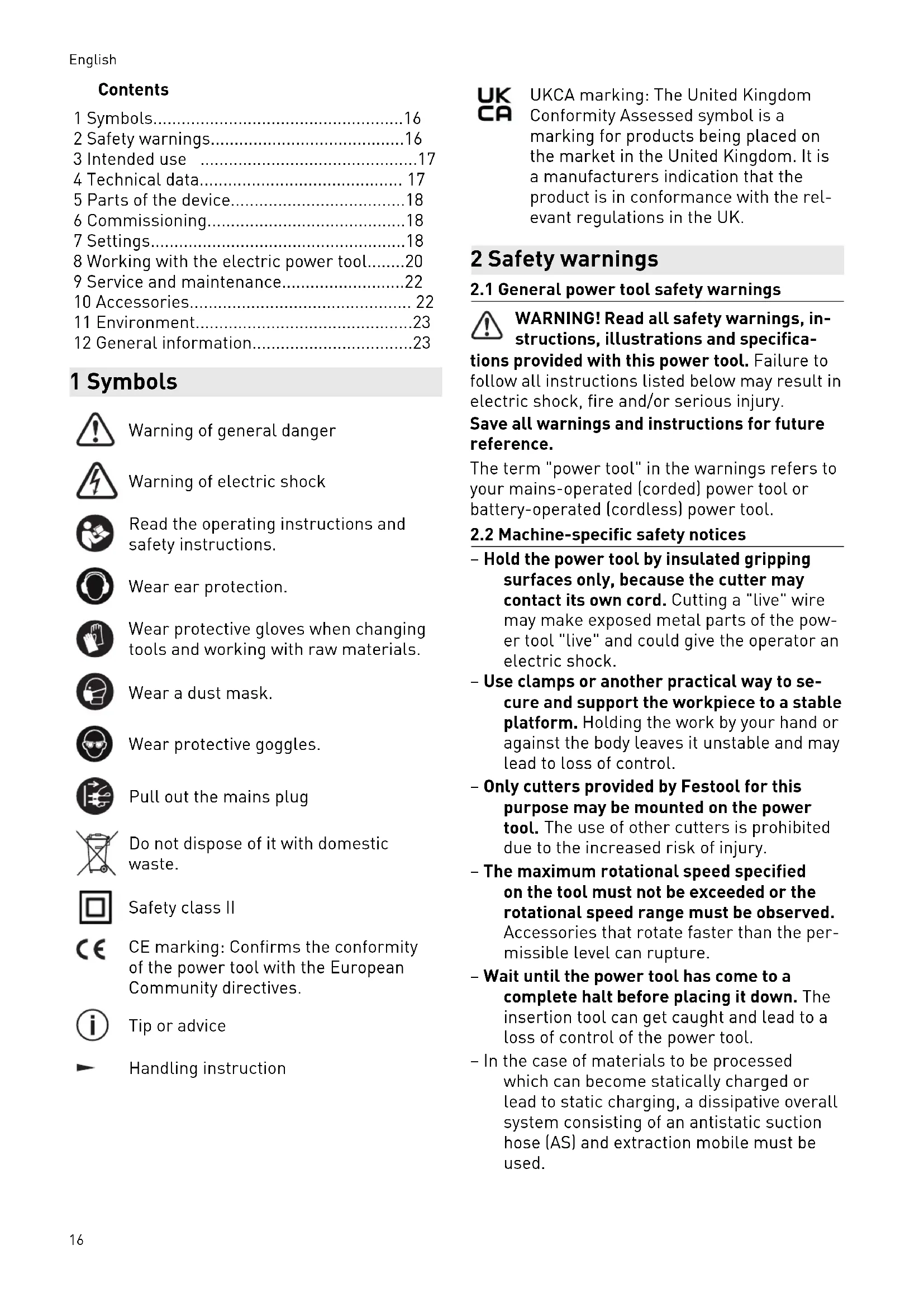 - 12 General information 1 Symbols Warning of general danger Warning of electric shock Read the operating instructions and safety instructions. Wear ear protection. Wear protective gloves when changing tools and working with raw materials. Wear a dust mask. Wear protective goggles. Pull out the mains plug Do not dispose of it with domestic waste. Safety class II CE marking: Confirms the conformity of the power tool with the European Community directives. Tip or advice Handling instruction UKCA marking: The United Kingdom Conformity Assessed symbol is a marking for products being placed on the market in the United Kingdom. It is a manufacturers indication that the product is in conformance with the rel evant regulations in the UK. 2 Safety warnings p. 23