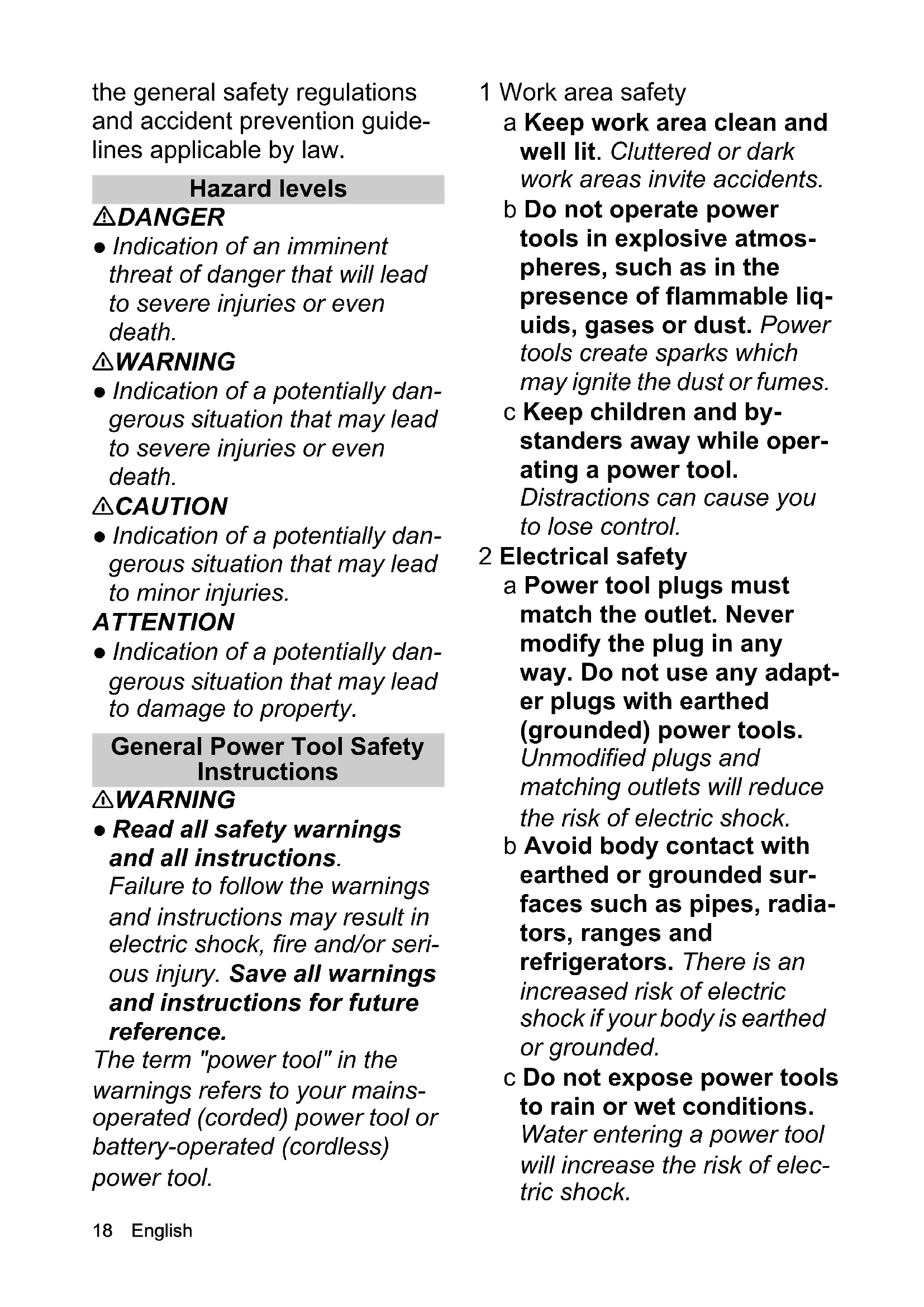 - EU Declaration of Conformity Chairman of the Board of ManagementDirector Regulatory Affairs & Certification H. Jenner S. Reiser18 English the general safety regulations and accident prevention guide- lines applicable by law. Hazard levels DANGER ● Indication of an imminent threat of danger that will lead to severe injuries or even death. 몇 WARNING ● Indication of a potentially dan- gerous situation that may lead to severe injuries or even death. 몇 CAUTION ● Indication of a potentially dan- gerous situation that may lead to minor injuries. ATTENTION ● Indication of a potentially dan- gerous situation that may lead to damage to property. General Power Tool Safety Instructions 몇 WARNING ● Read all safety warnings and all instructions. Failure to follow the warnings and instructions may result in electric shock, fire and/or seri- ous injury. Save all warnings and instructions for future reference. The term "power tool" in the warnings refers to your mains- operated (corded) power tool or battery-operated (cordless) power tool. 1 Work area safety a Keep work area clean and well lit. Cluttered or dark work areas invite accidents. b Do not operate power tools in explosive atmos- pheres, such as in the presence of flammable liq- uids, gases or dust. Power tools create sparks which may ignite the dust or fumes. c Keep children and by- standers away while oper- ating a power tool. Distractions can cause you to lose control. 2 Electrical safety a Power tool plugs must match the outlet. Never modify the plug in any way. Do not use any adapt- er plugs with earthed (grounded) power tools. Unmodified plugs and matching outlets will reduce the risk of electric shock. b Avoid body contact with earthed or grounded sur- faces such as pipes, radia- tors, ranges and refrigerators. There is an increased risk of electric shock if your body is earthed or grounded. c Do not expose power tools to rain or wet conditions. Water entering a power tool will increase the risk of elec- tric shock.English 19 d Do not abuse the cord. Never use the cord for car- rying, pulling or unplug- ging the power tool. Keep cord away from heat, oil, sharp edges or moving parts. Damaged or entan- gled cords increase the risk of electric shock. e When operating a power tool outdoors, use an ex- tension cord suitable for outdoor use. Use of a cord suitable for outdoor use re- duces the risk of electric shock. f If operating a power tool in a damp location is una- voidable, use a residual current device (RCD) pro- tected supply. Use of an RCD reduces the risk of electric shock. 3 Personal safety a Stay alert, watch what you are doing and use com- mon sense when operat- ing a power tool. Do not use a power tool while you are tired or under the influ- ence of drugs, alcohol or medication. A moment of inattention while operating power tools may result in se- rious personal injury. b Use personal protective equipment. Always wear eye protection. Protective equipment such as dust mask, non-skid safety shoes, hard hat, or hearing protection used for appropri- ate conditions will reduce personal injuries. c Prevent unintentional starting. Ensure the switch is in the off-posi- tion before connecting to power source and/or bat- tery pack, picking up or carrying the tool. Carrying power tools with your finger on the switch or energising power tools that have the switch on invites accidents. d Remove any adjusting key or wrench before turning the power tool on. A wrench or a key left attached to a rotating part of the pow- er tool may result in personal injury. e Do not overreach. Keep proper footing and bal- ance at all times. This ena- bles better control of the power tool in unexpected sit- uations. f Dress properly. Do not wear loose clothing or jewellery. Keep your hair, clothing and gloves away from moving parts. Loose clothes, jewellery or long hair can be caught in moving parts. g If devices are provided for the connection of dust ex-20 English traction and collection fa- cilities, ensure these are connected and properly used. Use of dust collection can reduce dust-related haz- ards. 4 Power tool use and care a Do not force the power tool. Use the correct pow- er tool for your applica- tion. The correct power tool will do the job better and saf- er at the rate for which it was designed. b Do not use the power tool if the switch does not turn it on and off. Any power tool that cannot be controlled with the switch is dangerous and must be repaired. c Disconnect the plug from the power source and/or the battery pack from the power tool before making any adjustments, chang- ing accessories, or storing power tools. Such preven- tive safety measures reduce the risk of starting the power tool accidentally. d Store idle power tools out of the reach of children and do not allow persons unfamiliar with the power tool or these instructions to operate the power tool. Power tools are dangerous in the hands of untrained us- ers. e Maintain power tools. Check for misalignment or binding of moving parts, breakage of parts and any other condition that may affect the power tool’s op- eration. If damaged, have the power tool repaired before use. Many accidents are caused by poorly main- tained power tools. f Keep cutting tools sharp and clean. Properly main- tained cutting tools with sharp cutting edges are less likely to bind and are easier to control. g Use the power tool, acces- sories and tool bits etc. in accordance with these in- structions, taking into ac- count the working conditions and the work to be performed. Use of the power tool for operations dif- ferent from those intended could result in a hazardous situation. 5 Battery tool use and care a Recharge only with the chargers specified by the manufacturer. A charger that is suitable for one type of battery pack may create a risk of fire when used with another battery pack. b Use power tools only with specifically designated battery packs. Use of anyEnglish 21 other battery pack
