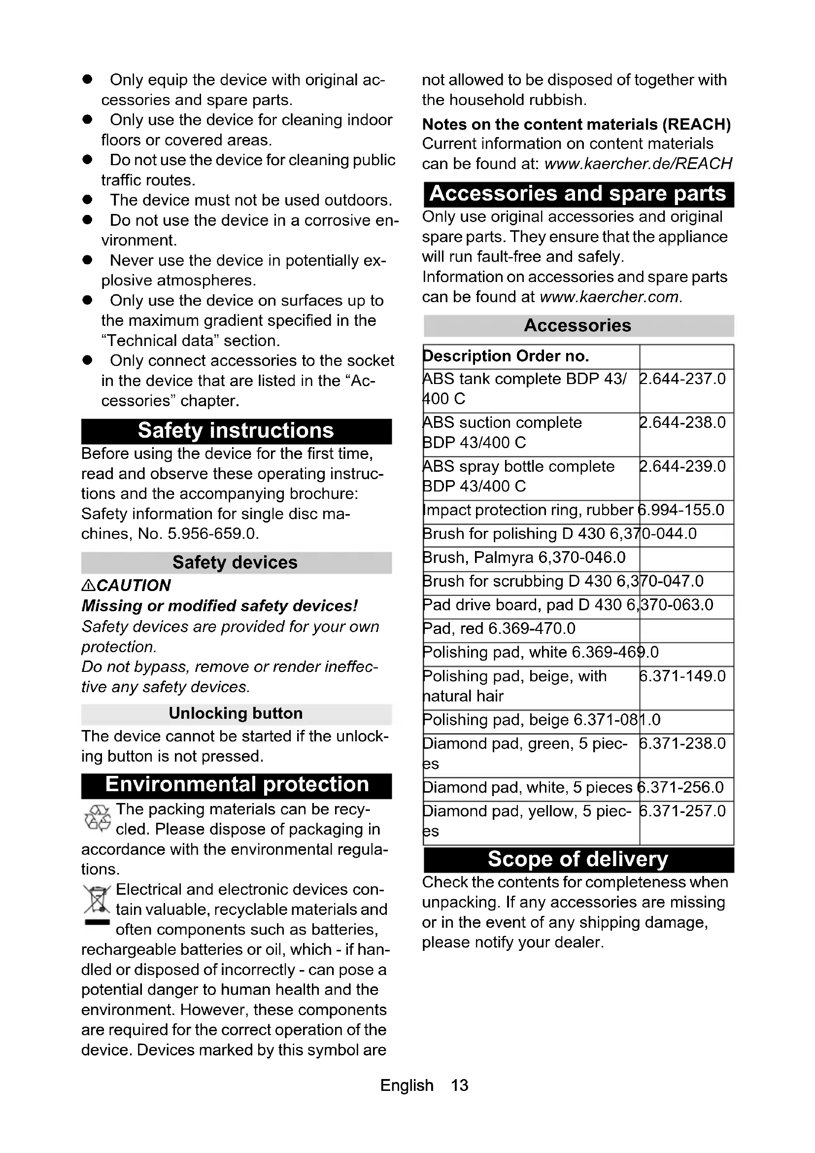 - Declaration of Conformity English 13 Only equip the device with original ac- cessories and spare parts. Only use the device for cleaning indoor floors or covered areas. Do not use the device for cleaning public traffic routes. The device must not be used outdoors. Do not use the device in a corrosive en- vironment. Never use the device in potentially ex- plosive atmospheres. Only use the device on surfaces up to the maximum gradient specified in the “Technical data” section. Only connect accessories to the socket in the device that are listed in the “Ac- cessories” chapter. Safety instructions Before using the device for the first time, read and observe these operating instruc- tions and the accompanying brochure: Safety information for single disc ma- chines, No. 5.956-659.0. Safety devices 몇 CAUTION Missing or modified safety devices! Safety devices are provided for your own protection. Do not bypass, remove or render ineffec- tive any safety devices. Unlocking button The device cannot be started if the unlock- ing button is not pressed. Environmental protection The packing materials can be recy- cled. Please dispose of packaging in accordance with the environmental regula- tions. Electrical and electronic devices con- tain valuable, recyclable materials and often components such as batteries, rechargeable batteries or oil, which - if han- dled or disposed of incorrectly - can pose a potential danger to human health and the environment. However, these components are required for the correct operation of the device. Devices marked by this symbol are not allowed to be disposed of together with the household rubbish. Notes on the content materials (REACH) Current information on content materials can be found at: www.kaercher.de/REACH Accessories and spare parts Only use original accessories and original spare parts. They ensure that the appliance will run fault-free and safely. Information on accessories and spare parts can be found at www.kaercher.com. Accessories Scope of delivery Check the contents for completeness when unpacking. If any accessories are missing or in the event of any shipping damage, please notify your dealer. Description Order no. ABS tank complete BDP 43/ 400 C 2.644-237.0 ABS suction complete BDP 43/400 C 2.644-238.0 ABS spray bottle complete BDP 43/400 C 2.644-239.0 Impact protection ring, rubber 6.994-155.0 Brush for polishing D 430 6,370-044.0 Brush, Palmyra 6,370-046.0 Brush for scrubbing D 430 6,370-047.0 Pad drive board, pad D 430 6,370-063.0 Pad, red 6.369-470.0 Polishing pad, white 6.369-469.0 Polishing pad, beige, with natural hair 6.371-149.0 Polishing pad, beige 6.371-081.0 Diamond pad, green, 5 piec- p. 19
