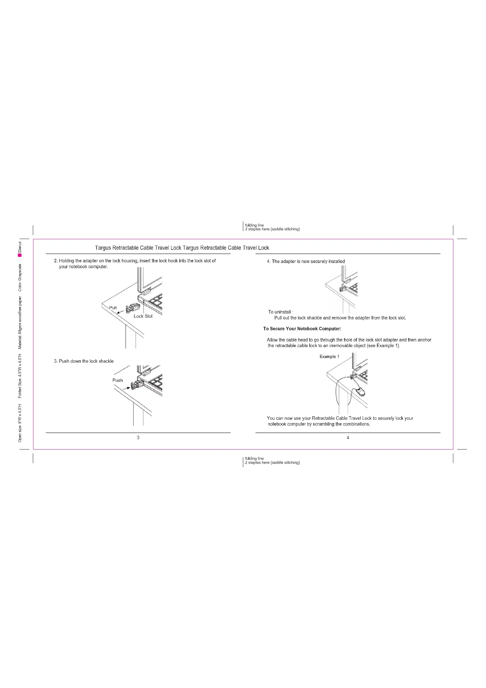 Retractable Cable Travel Lock User Guide folding line 2 staples here (saddle stitching) folding line 2 staples here (saddle stitching) Open size: 9”W x 4.5”H Folded Size: 4.5”W x 4.5”H Material: 80gsm woodfree paper Color: Grayscale Diecut